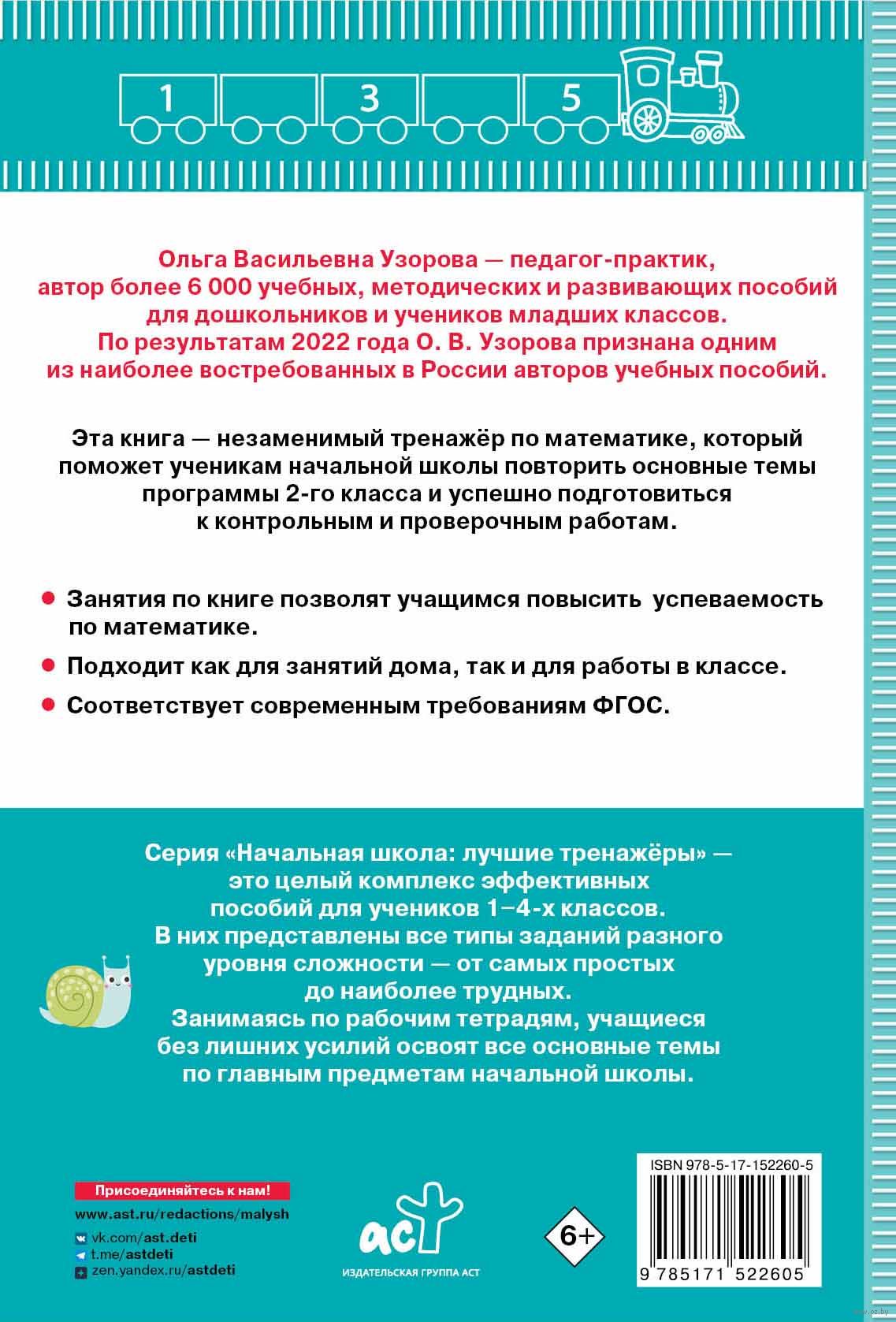 "Тренажёр по математике. 2-й класс" – это эффективный комплекс упражнений по математике, основанный на авторской методике О. В. Узоровой. Выполняя задания, школьники повторят наиболее сложные темы программы 2-го класса и научатся на практике применять знания, полученные в процессе обучения. Пособие можно использовать для занятий дома и в классе по всем федеральным программам начальной школы.