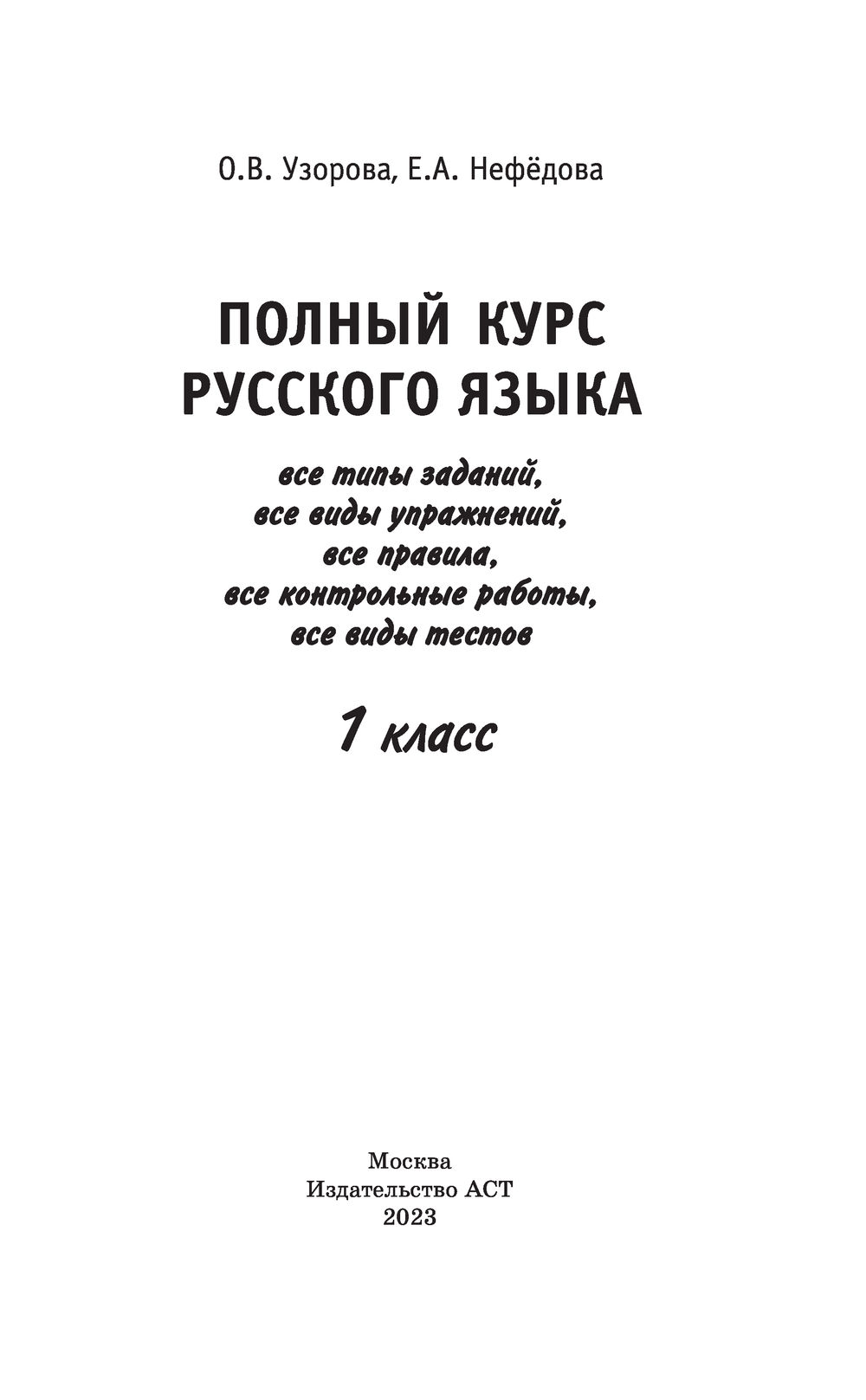 Пособие содержит материал по всем темам курса русского языка для 1 класса: все типы заданий, виды упражнений, правила, контрольные работы и тесты, необходимые для успешного обучения ребёнка.