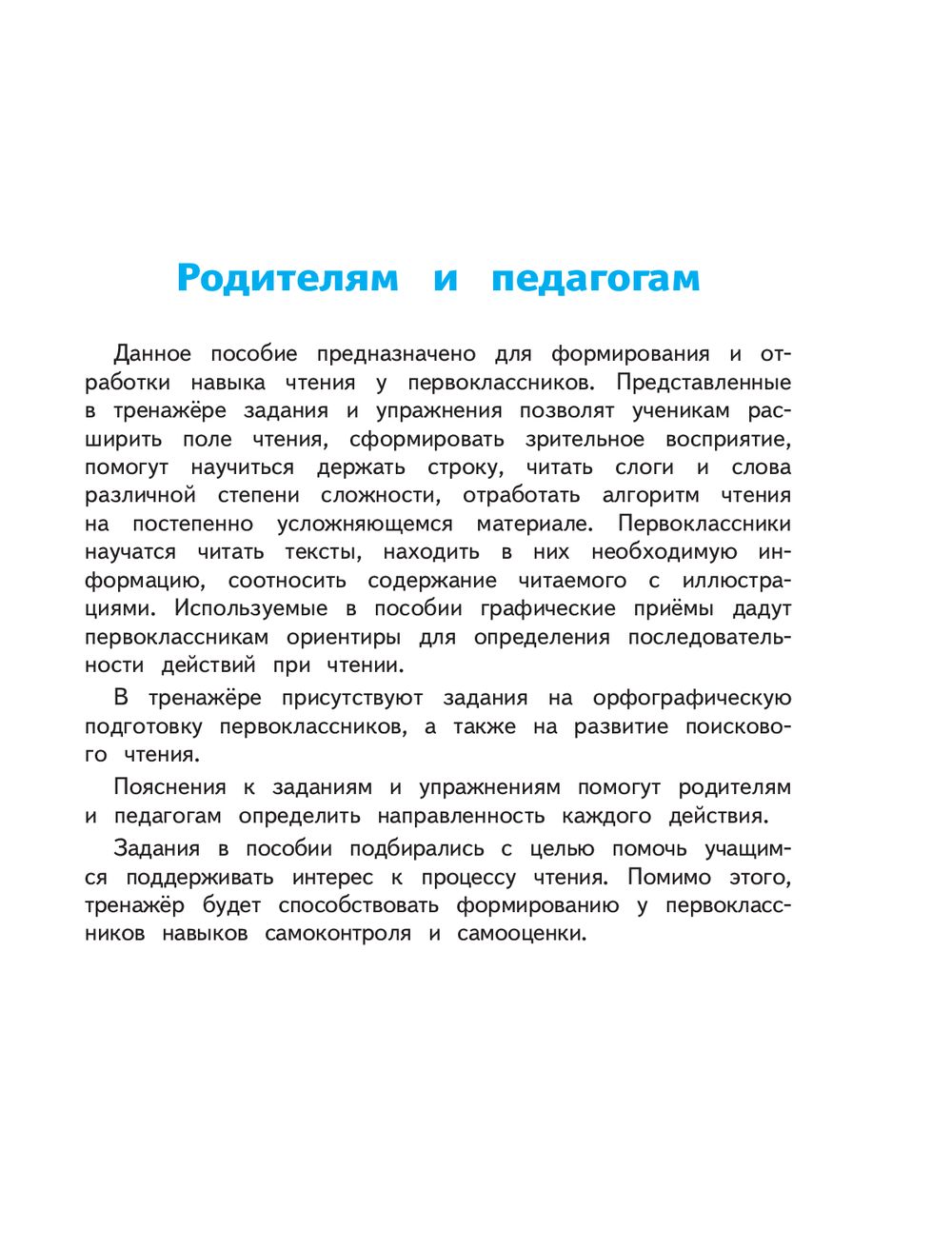Данный тренажёр предназначен для развития навыков чтения у учеников 1 класса. Задания способствуют расширению поля чтения, развитию навыка слитного чтения слогов и слов, формированию осознанного чтения. Отдельные задания снабжены ответами. Для взрослых приводятся указания и методические рекомендации, как правильно выполнять те или иные упражнения.