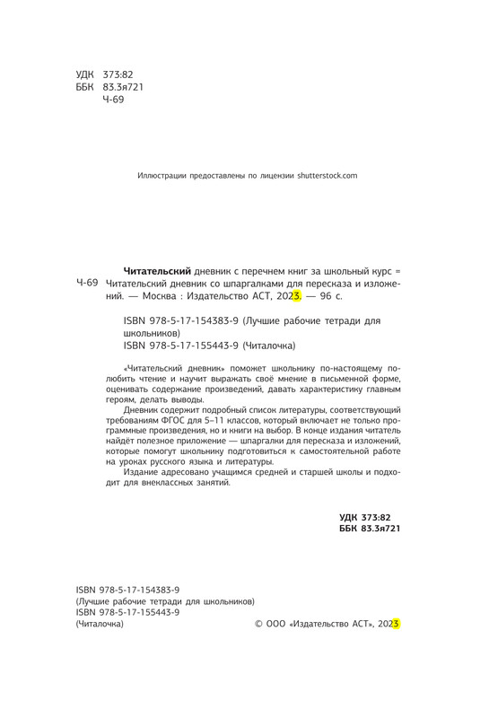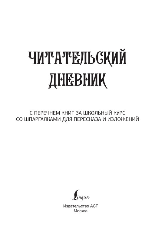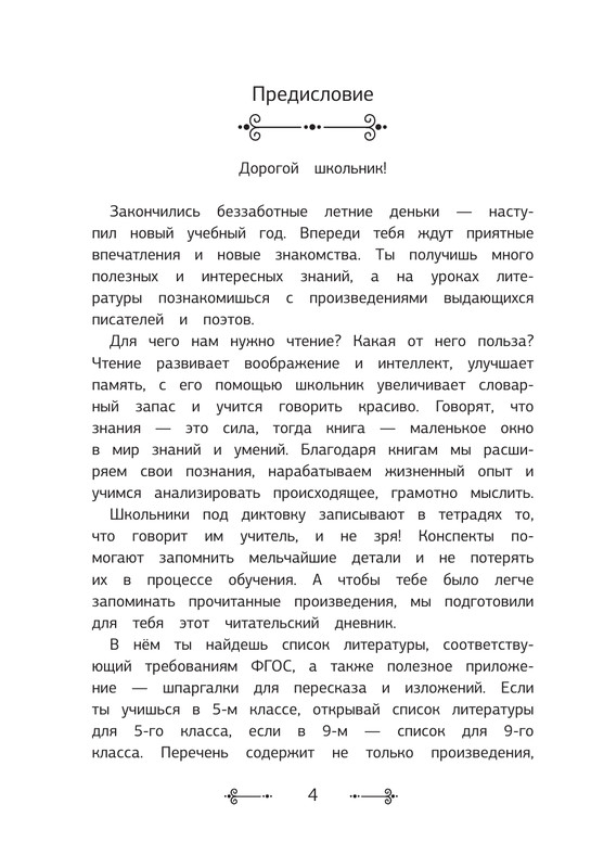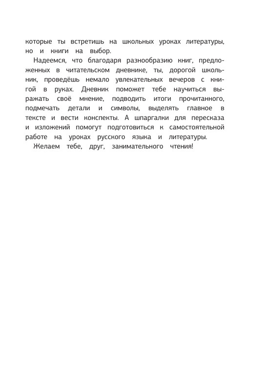 Дневник содержит подробный список литературы, соответствующий требованиям ФГОС для 5-11 классов, который включает не только программные произведения, но и книги на выбор. В конце издания читатель найдёт полезное приложение – шпаргалки для пересказа и изложений, которые помогут школьнику подготовиться к самостоятельной работе на уроках русского языка и литературы.