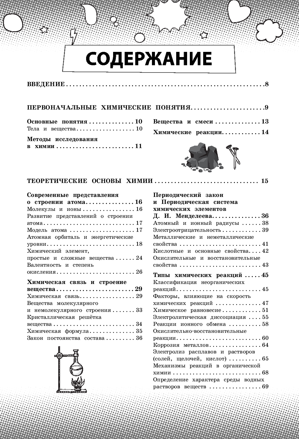 В книге представлены разделы "Первоначальные химические понятия", "Теоретические основы химии", "Неорганическая химия", "Органическая химия", "Условия протекания и признаки химических реакций", "Расчёты по химическим формулам и уравнениям реакций", "Методы познания в химии". Помимо этого, пособие содержит тренировочные задания с ответами и подробными решениями.