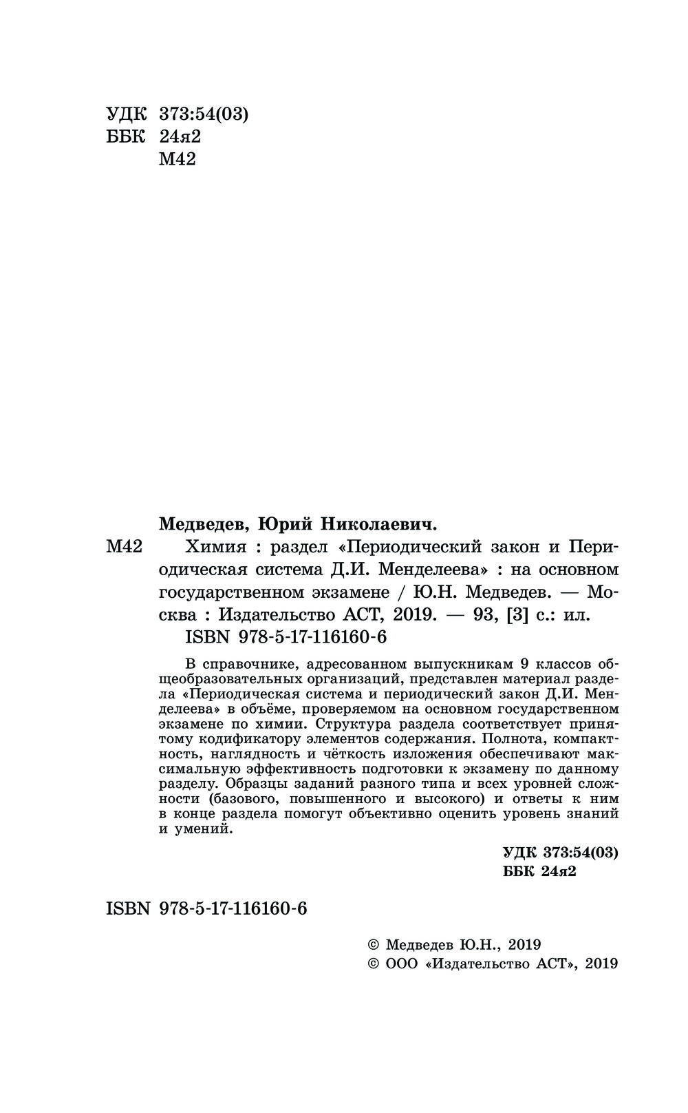 В справочнике, адресованном выпускникам 9 классов общеобразовательных организаций, представлен материал раздела "Периодическая система и периодический закон Д. И. Менделеева" в объёме, проверяемом на основном государственном экзамене по химии. Структура раздела соответствует принятому кодификатору элементов содержания. Полнота, компактность, наглядность и чёткость изложения обеспечивают максимальную эффективность подготовки к экзамену по данному разделу. Образцы заданий разного типа и всех уровней сложности (базового, повышенного и высокого) и ответы к ним в конце раздела помогут объективно оценить уровень знаний и умений.