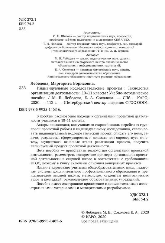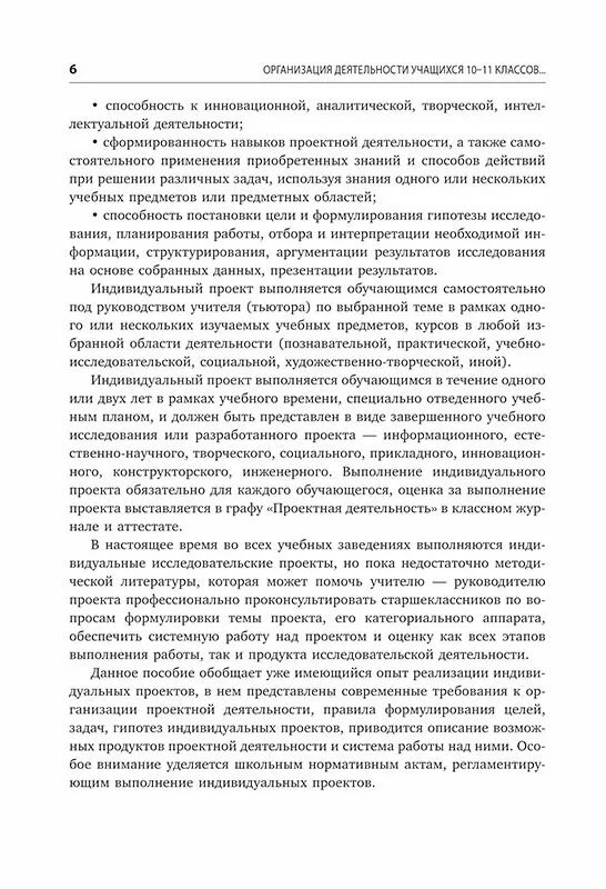В пособии рассмотрены подходы к организации проектной деятельности учащихся в 10–11 классах. Авторы показывают, как учащимся старшей школы перейти от групповой проектной работы к индивидуальному исследованию, спланировать индивидуальный исследовательский проект, описать его цели, задачи, результаты, сформулировать и доказать или опровергнуть гипотезу, осуществить основные этапы реализации проекта, получить планируемый продукт проектной деятельности. Цель пособия – представить технологию организации проектной деятельности, рассмотреть конкретные примеры организации проектной деятельности в старшей школе в соответствии с требованиями ФГОС, поэтому в книгу включены описания конкретных проектов.