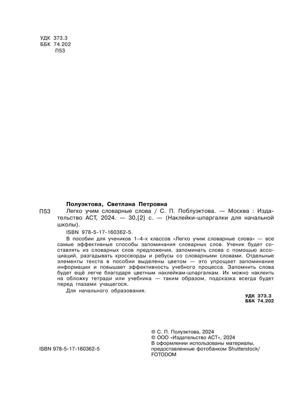В пособии для учеников 1-4 классов "Легко учим словарные слова" – все самые эффективные способы запоминания словарных слов. Ученик будет составлять из словарных слов предложения, запоминать слова с помощью ассоциаций, разгадывать кроссворды и ребусы со словарными словами. Отдельные элементы текста в пособии выделены цветом – это упрощает запоминание информации и повышает эффективность учебного процесса. Запомнить слова будет ещё легче благодаря цветным наклейкам-шпаргалкам. Их можно наклеить на обложку тетради или учебника – таким образом, подсказки всегда будет перед глазами учащегося.