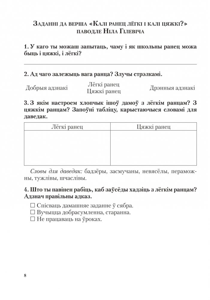 Заданні складзены да большасці твораў дапаможніка. Акрамя таго, прапануюцца таксама заданні абагульняючага характару. Заданні прадстаўлены ў выглядзе картак для індывідуальнай, групавой і калектыўнай работы.