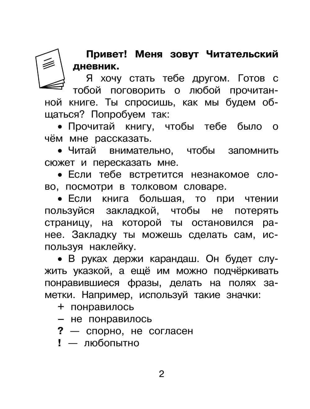 У вас в руках читательский дневник, который на целый год станет твоим настоящим другом. Раньше вам читали книги взрослые, теперь вы становитесь профессиональным читателем. В этом вам и поможет этот дневник.