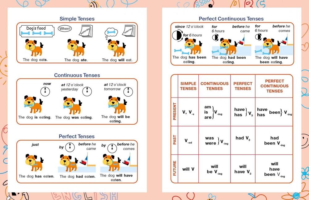 Пособие содержит основные правила применения английских времён, которые должен знать школьник. На листе с наклейками есть все образцы применения двенадцати английских времён с примерами, а также таблица с формулами построения этих времён. Ребёнок может наклеить эти шпаргалки на внутреннюю сторону обложки тетради, учебника или просто на видное место дома, чтобы быстрее выучить правило.