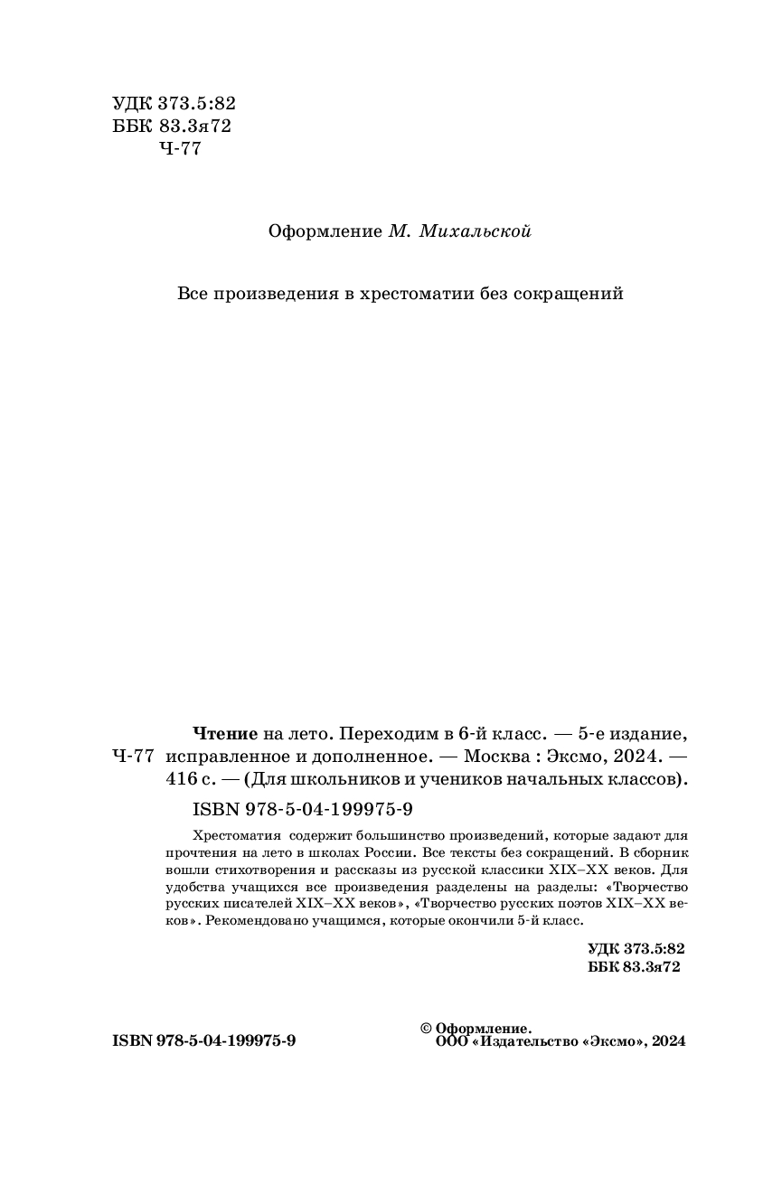 Хрестоматия содержит произведения, которые задают для чтения на лето в большинстве школ России. В состав хрестоматии вошли произведения писателей и поэтов XIX-XX веков: Пушкина, Лермонтова, Плещеева, Никитина, Маяковского, Чехова, Лескова, Горького, Пришвина, Платонова и других. Все тексты без сокращений. Хрестоматия направлена на то, чтобы привить ученику любовь к чтению, расширить его кругозор, развить речь. Кроме того, книга имеет очень удобный формат, ее можно взять с собой в дорогу или на отдых.