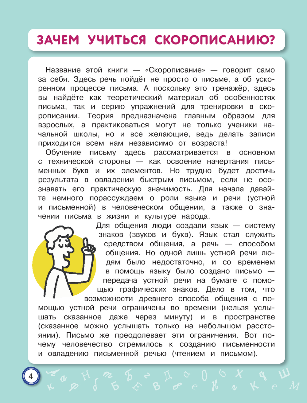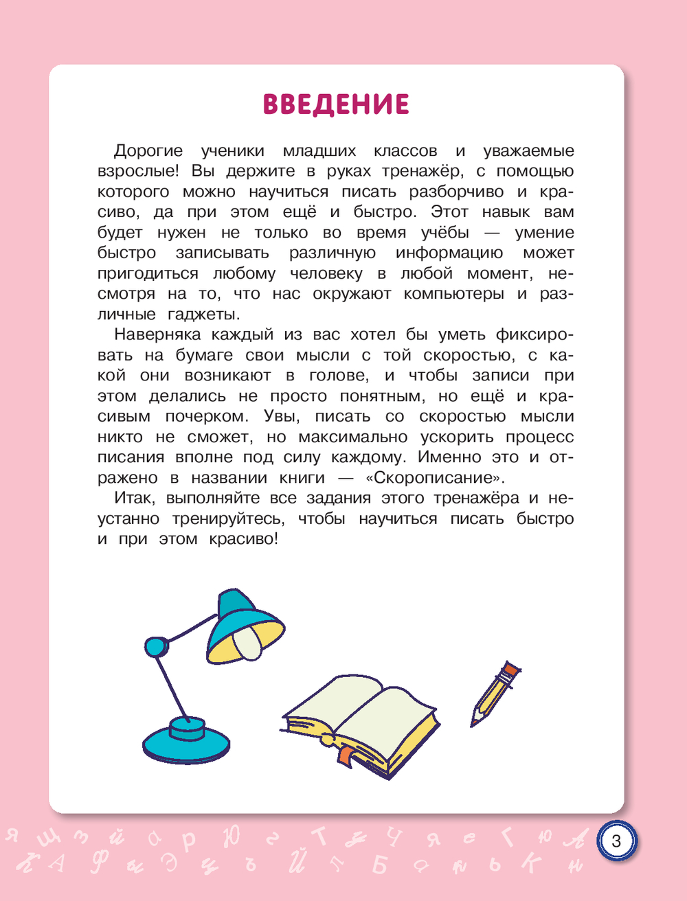 Тренажёр станет замечательным помощником для учеников начальных классов. С целью увеличения скорости письма и исправления почерка автором была разработана система уникальных упражнений. Благодаря игровому компоненту дети будут выполнять задания охотно и с неослабевающим интересом. Помимо достижения основной цели – увеличения скорости письма и выработки красивого почерка – ученики также разовьют мелкую моторику, память, усидчивость, внимание и пространственное мышление. Задания, учитывающие реальные возможности современных детей, расположены по мере усложнения.