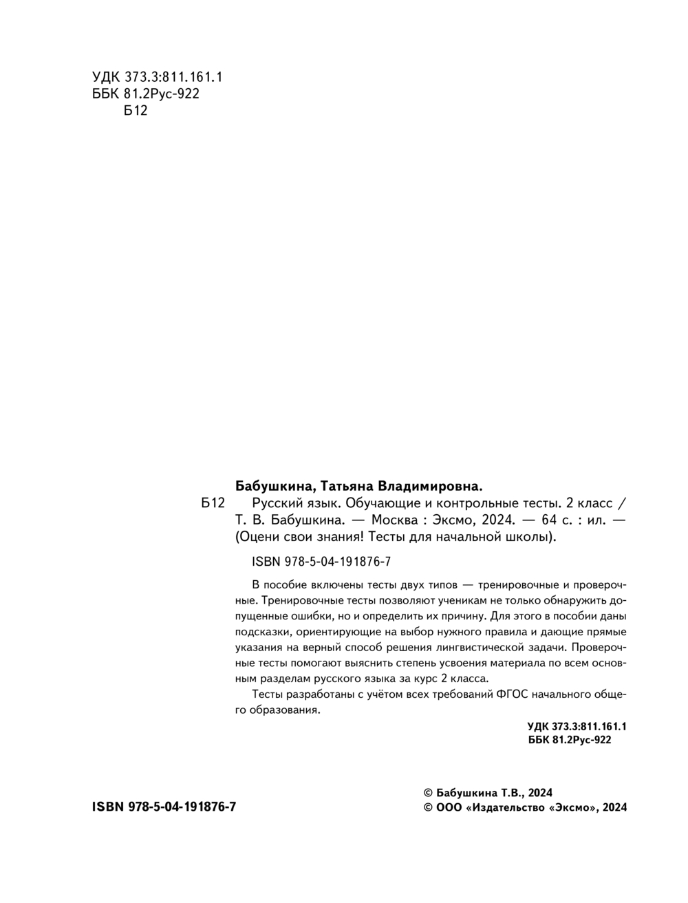 В пособие включены тесты двух типов – тренировочные и проверочные. Тренировочные тесты позволяют ученикам не только обнаружить допущенные ошибки, но и определить их причину. Для этого в пособии даны подсказки, ориентирующие на выбор нужного правила и дающие прямые указания на верный способ решения лингвистической задачи. Проверочные тесты помогают выяснить степень усвоения материала по всем основным разделам русского языка за курс 2 класса.