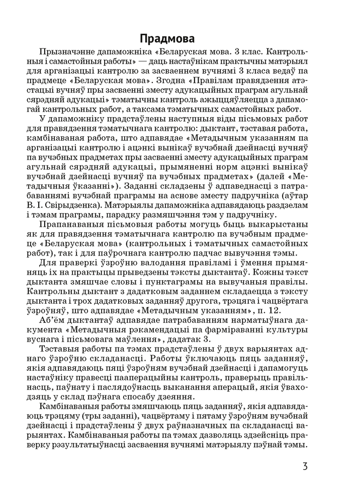 Дапаможнік змяшчае матэрыялы для арганізацыі кантрольна-ацэначнай дзейнасці вучняў 3 класа: тэставыя і камбінаваныя работы, дыктанты. Прапанаваныя заданні могуць быць выкарыстаны для правядзення кантрольных работ або падчас вывучэння тэмы.