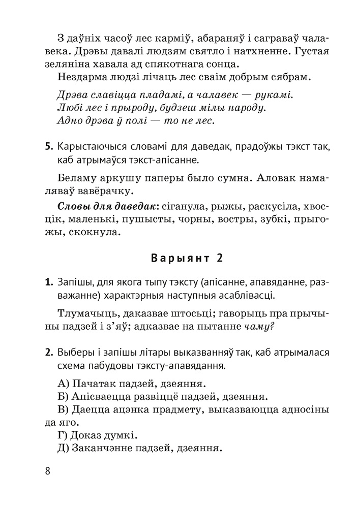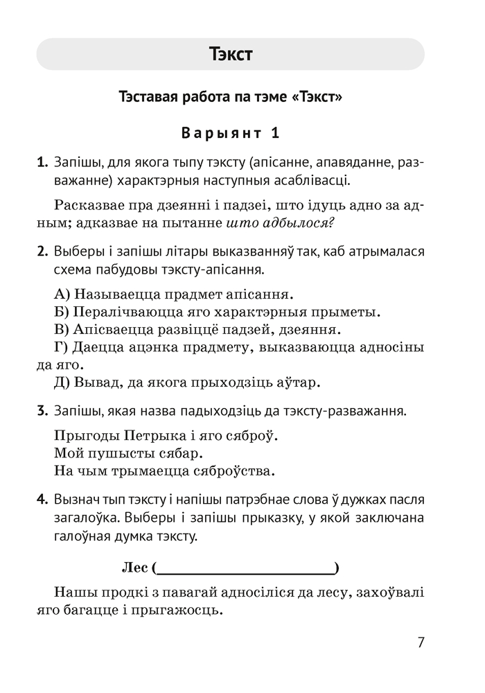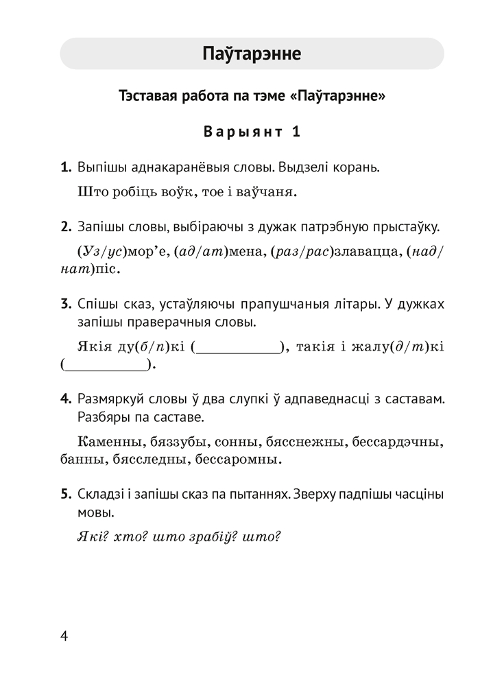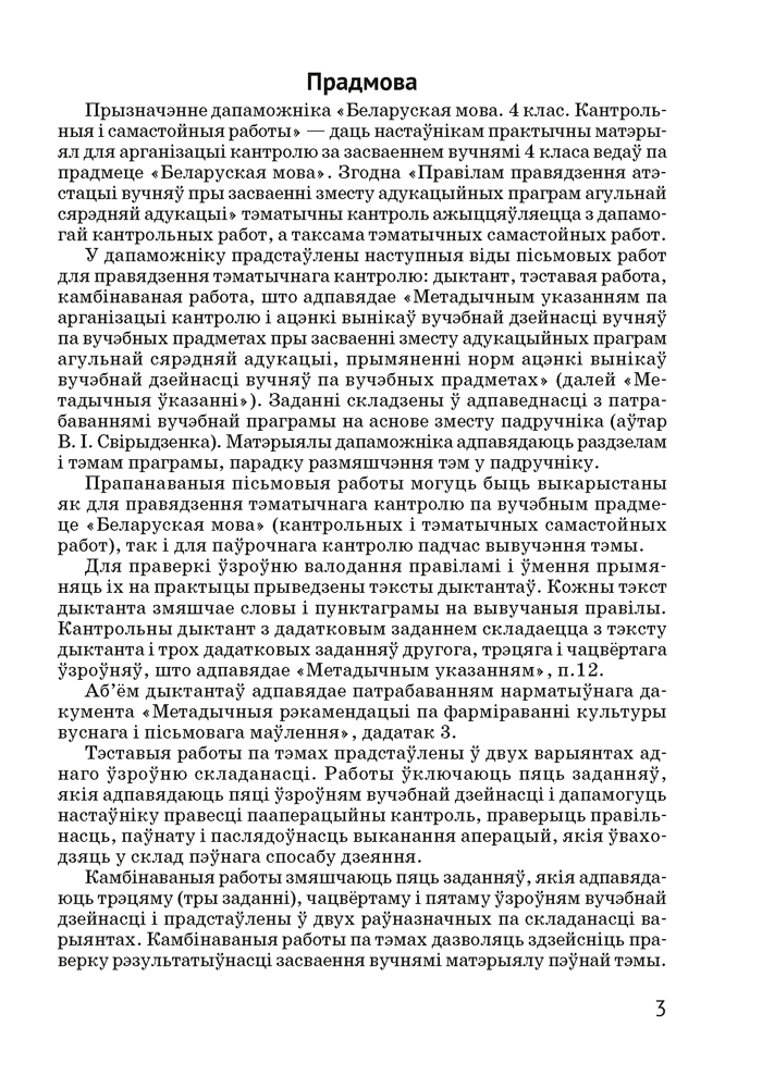 Дапаможнік змяшчае матэрыялы для арганізацыі кантрольна-ацэначнай дзейнасці вучняў 4 класа: тэставыя і камбінаваныя работы, дыктанты. Прапанаваныя заданні могуць быць выкарыстаны для правядзення кантрольных работ або падчас вывучэння тэмы.