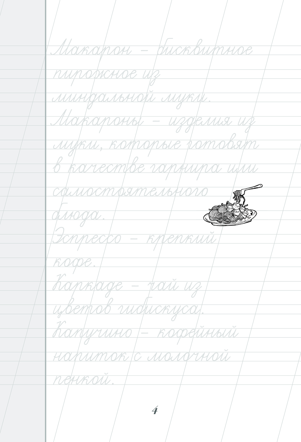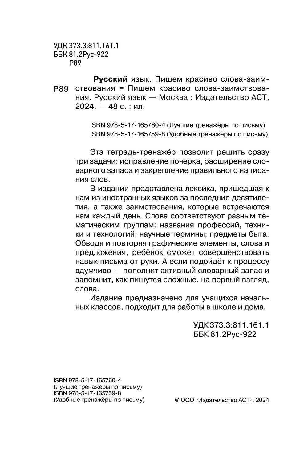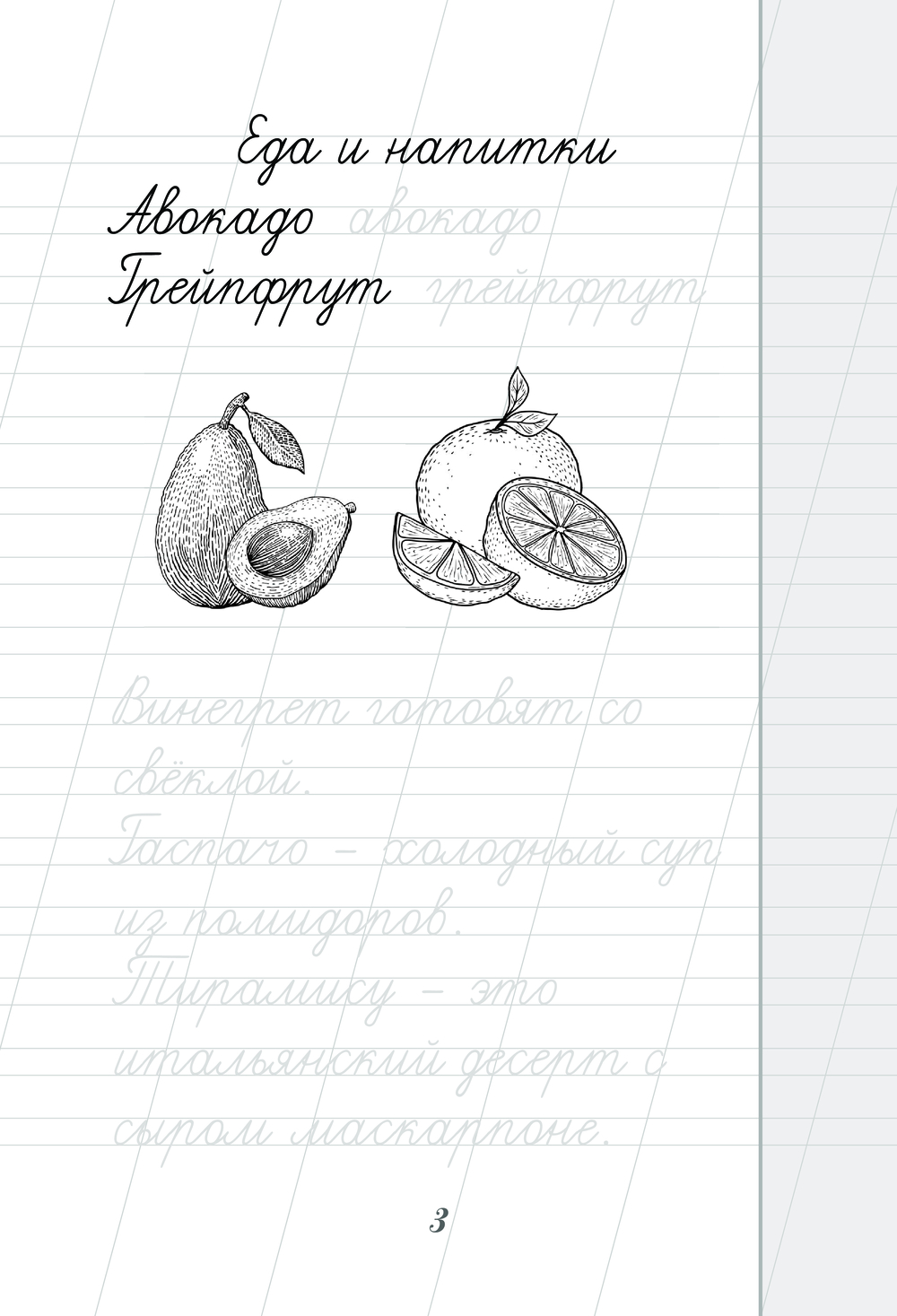 В издании представлена лексика, пришедшая к нам из иностранных языков за последние десятилетия, а также заимствования, которые встречаются нам каждый день. Слова соответствуют разным тематическим группам: названия профессий, техники и технологий; научные термины; предметы быта. Обводя и повторяя графические элементы, слова и предложения, ребёнок сможет совершенствовать навык письма от руки. А если подойдёт к процессу вдумчиво – пополнит активный словарный запас и запомнит, как пишутся сложные, на первый взгляд, слова.