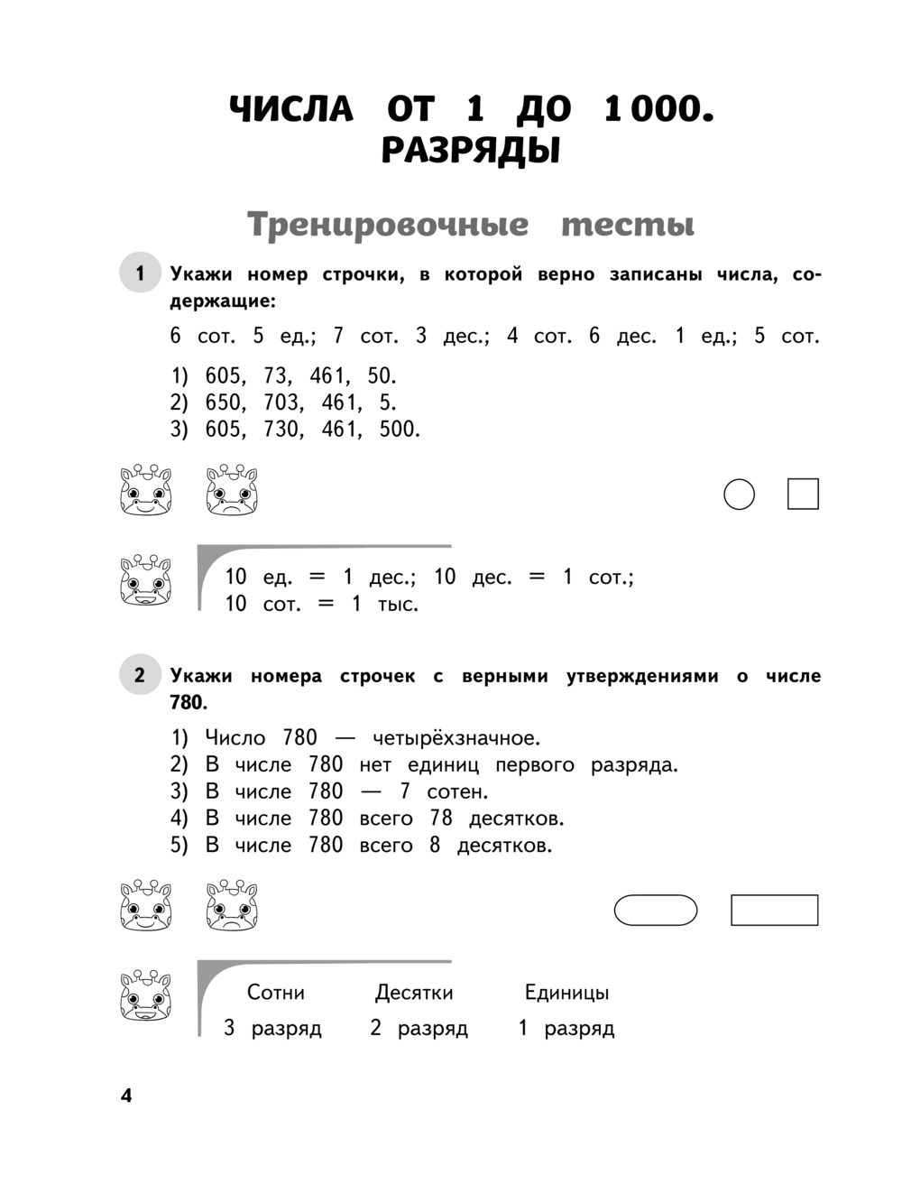 В пособие включены тесты двух типов – тренировочные и проверочные. Тренировочные тесты позволяют ученикам не только обнаружить допущенные ошибки, но и определить их причину. Для этого в пособии даны подсказки, ориентирующие на выбор нужного правила и дающие прямые указания на верный способ решения. Проверочные тесты помогают выяснить степень усвоения материала по всем основным разделам математики за курс 4 класса.