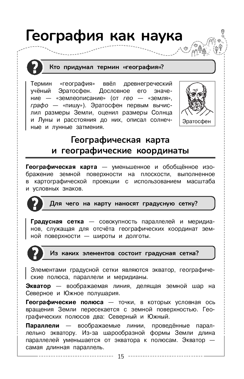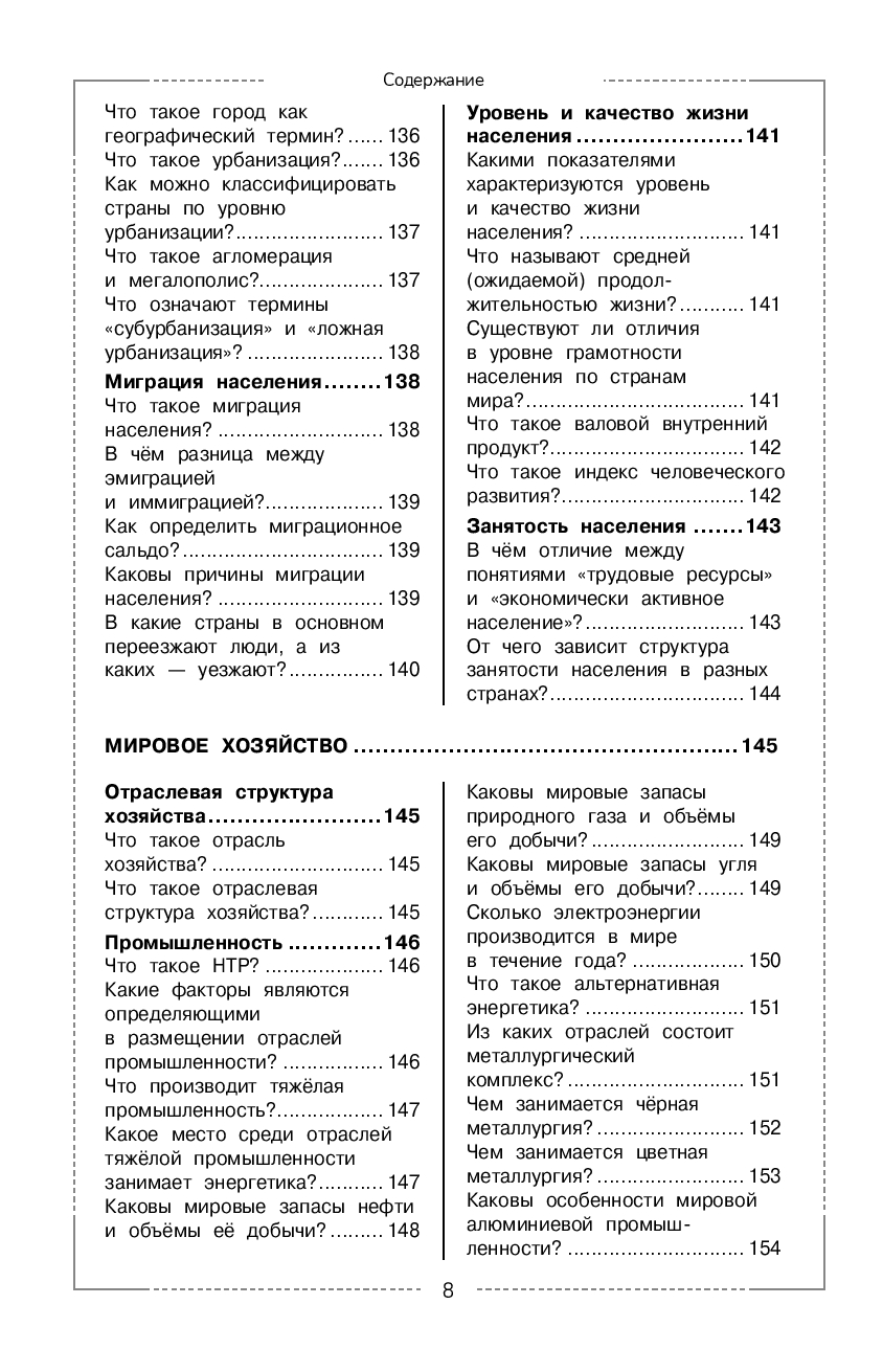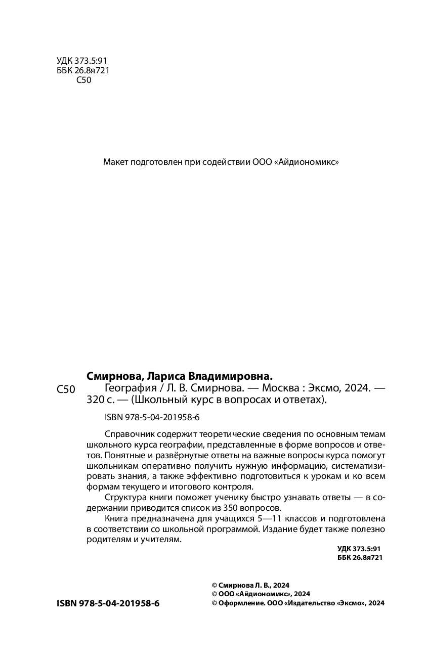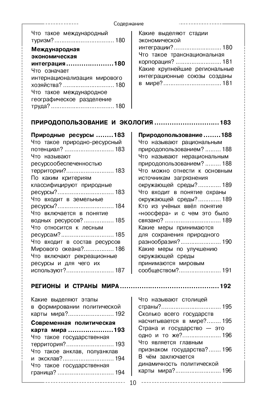 Справочник содержит теоретические сведения по основным темам школьного курса географии, представленных в форме вопросов и ответов. Понятные и развёрнутые ответы на важные вопросы курса помогут школьникам оперативно получить нужную информацию, систематизировать знания, а также эффективно подготовиться к урокам и ко всем формам текущего и итогового контроля.