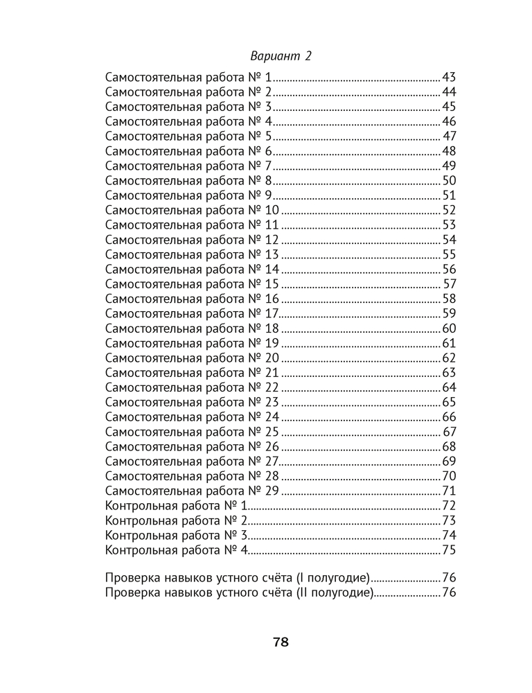 Пособие составлено в соответствии с учебной программой. Каждая самостоятельная и контрольная работа представлена в двух вариантах и соотносится с содержанием учебного пособия "Математика. 2 класс" (авторы Г. Л. Муравьёва, М. А. Урбан). В издании также размещён материал для проверки навыков устных вычислений.