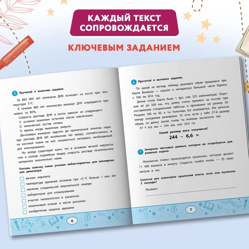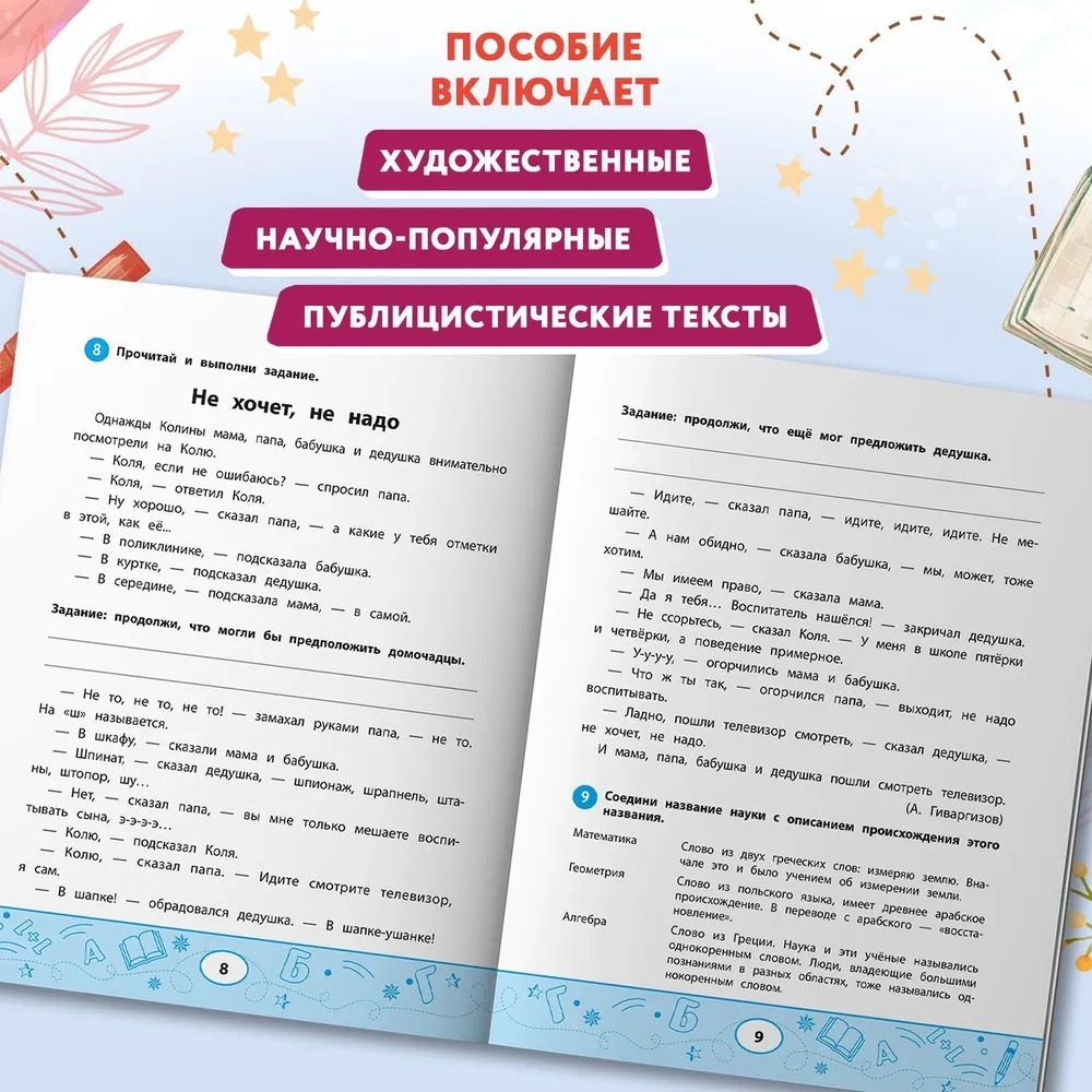 Упражнения активизируют читательское воображение: к каждому тексту есть одно ключевое задание, которое помогает включить мысленный видеоряд в процессе чтения. В результате ребёнок лучше понимает, о чём читает. Увлекательные задачки помогают освоить навык смыслового чтения.