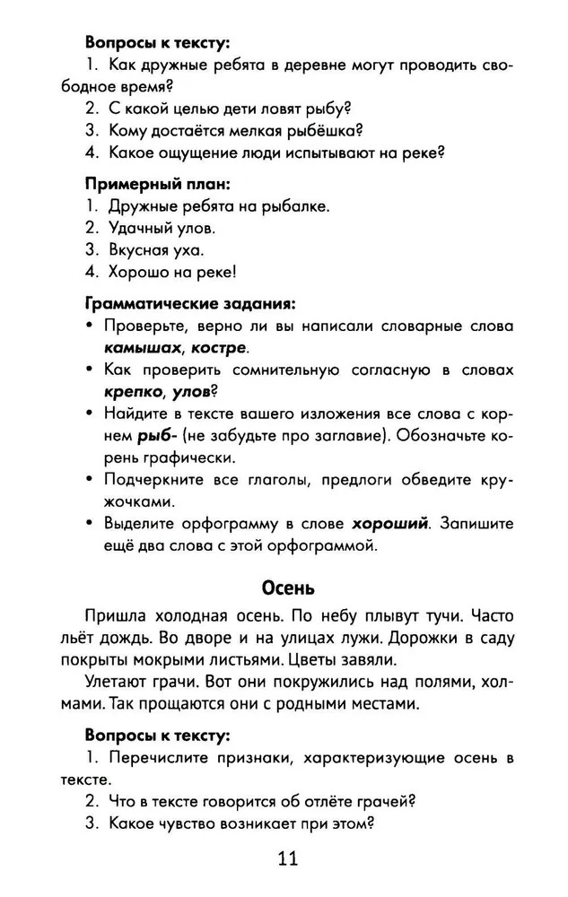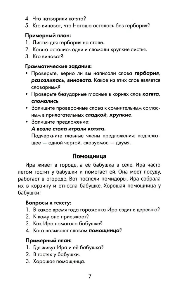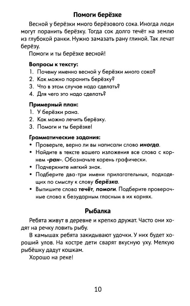 Каждый текст снабжён пятью заданиями по программному материалу с акцентом на грамматику. К первым двадцати текстам приводятся вопросы и примерный краткий план, которые помогут второкласснику написать изложение.