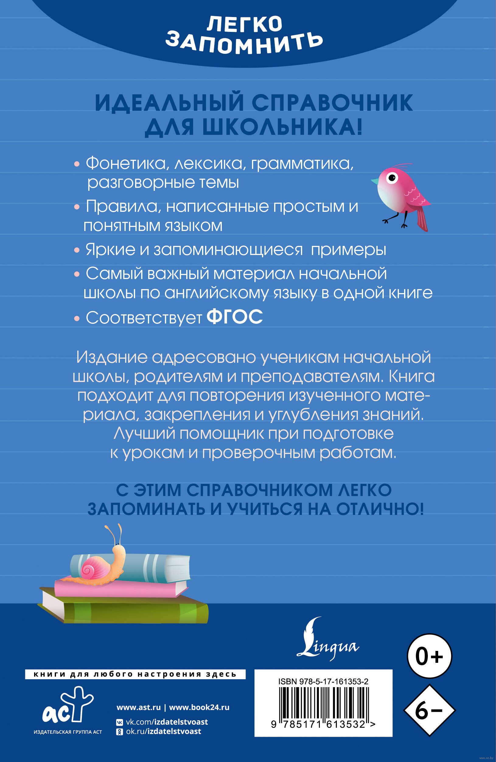 Перед вами современный, удобный в использовании справочник по английскому языку. В этом издании представлены все темы, которые изучают в начальной школе. Материал пособия проработан с учетом принципов ФГОС. Все правила написаны простым языком и сопровождаются запоминающимися примерами.