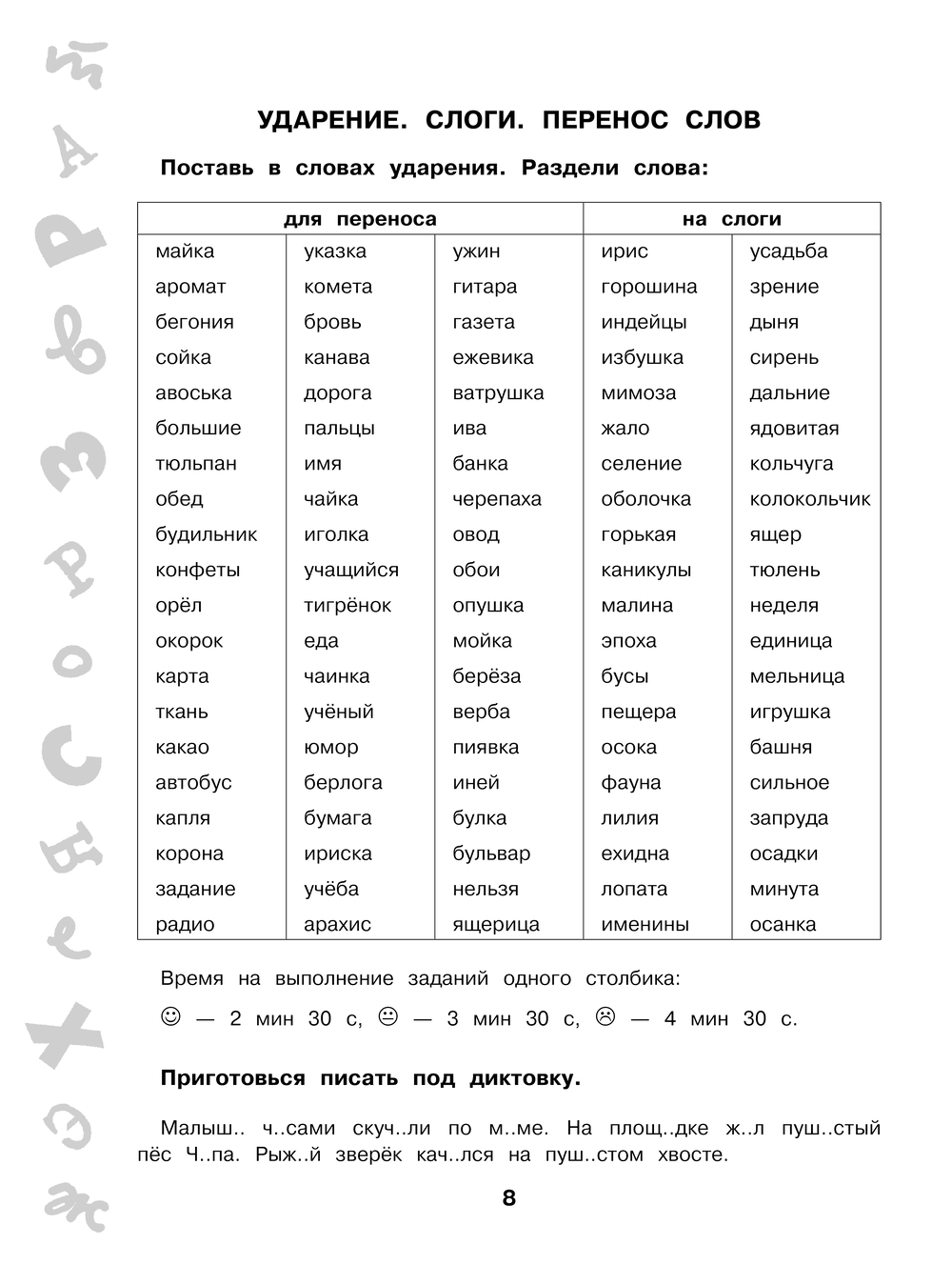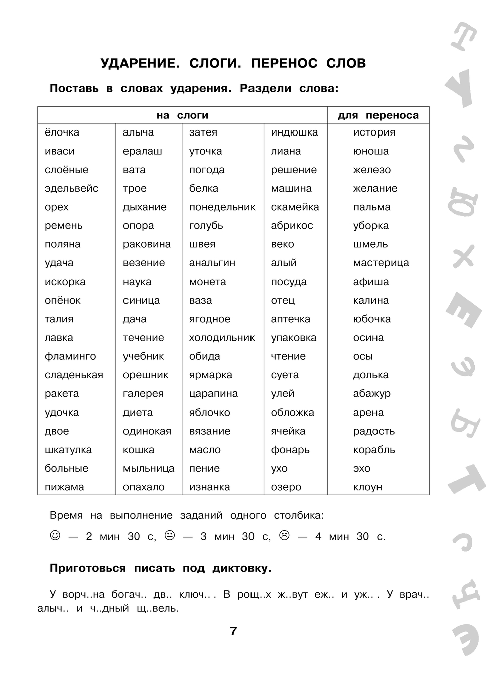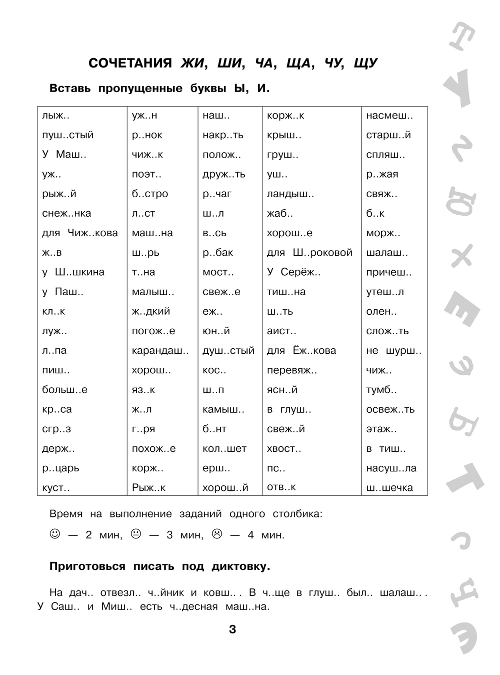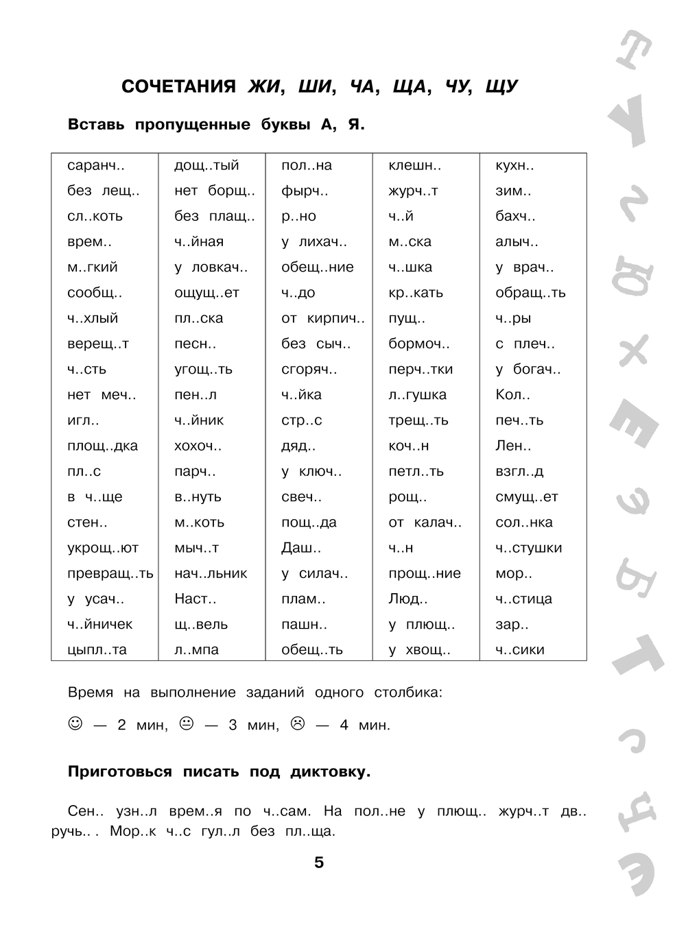 В пособие вошли задания на все орфограммы и правила, которые помогут ребёнку научиться писать грамотно и обеспечат более глубокое усвоение материала. Ребёнок будет не только списывать текст без ошибок и вставлять пропущенную букву или знак, но и найдёт ошибки в словах, выполнит задания на время, объяснит орфограммы в диктанте, повторит правила и словарные слова, выполнит тесты.