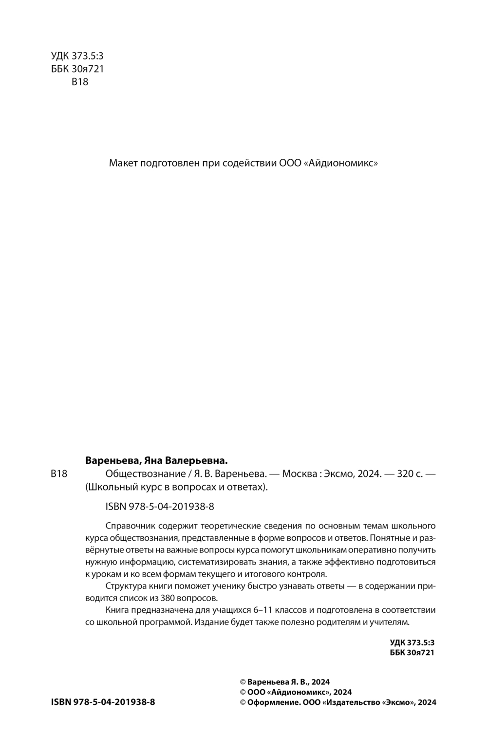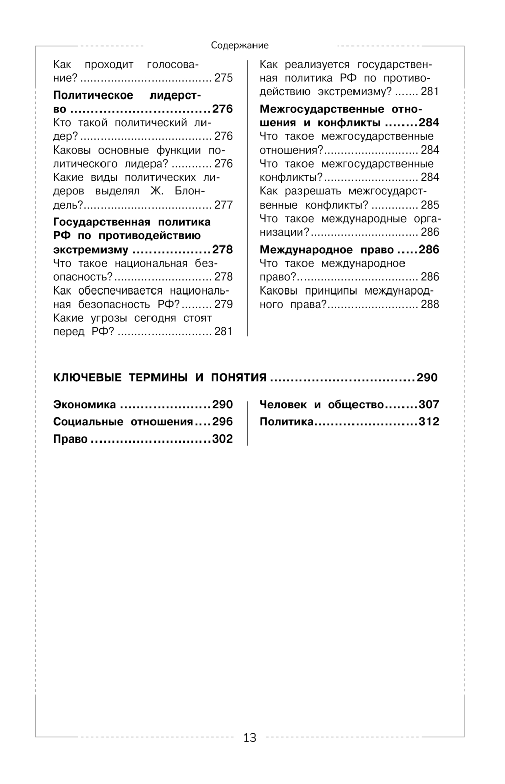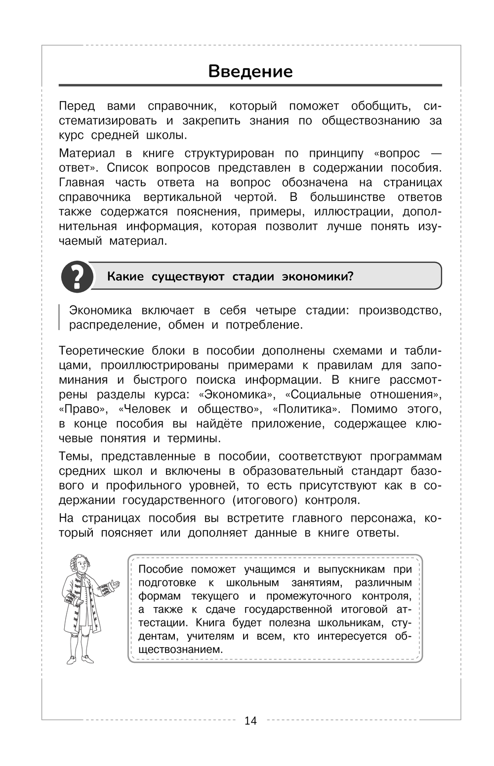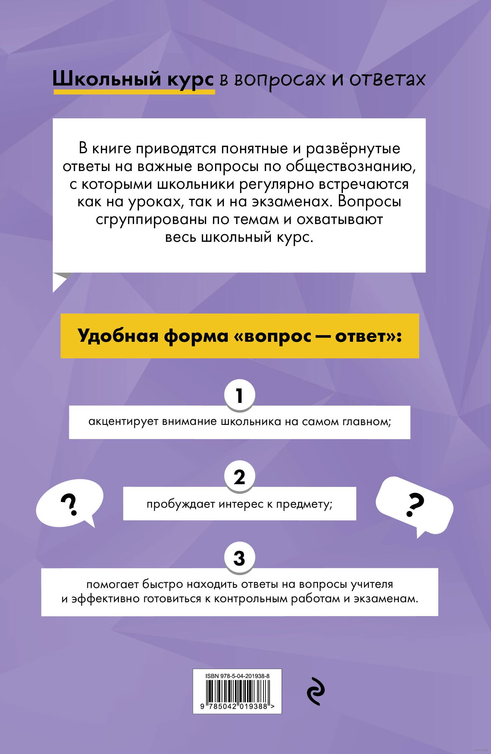 Справочник содержит теоретические сведения по основным темам школьного курса обществознания, представленные в форме вопросов и ответов. Понятные и развёрнутые ответы на важные вопросы курса помогут школьникам оперативно получить нужную информацию, систематизировать знания, а также эффективно подготовиться к урокам и ко всем формам текущего и итогового контроля.