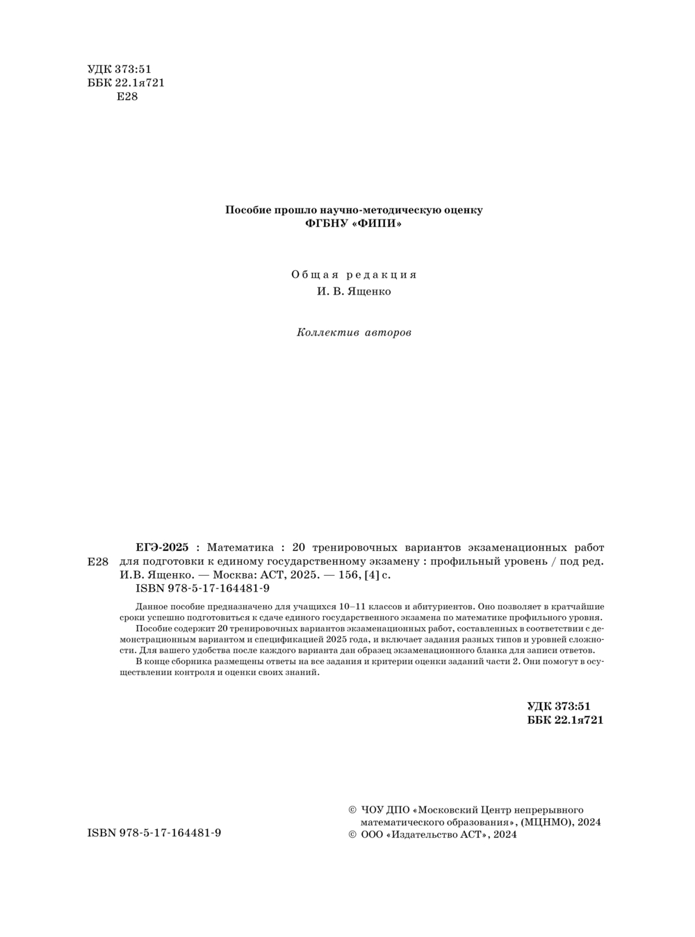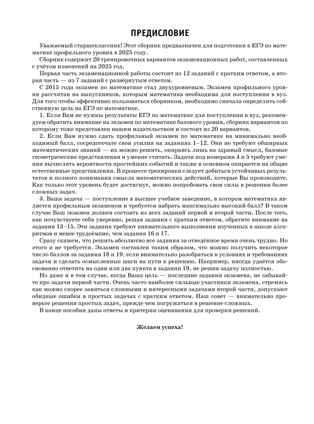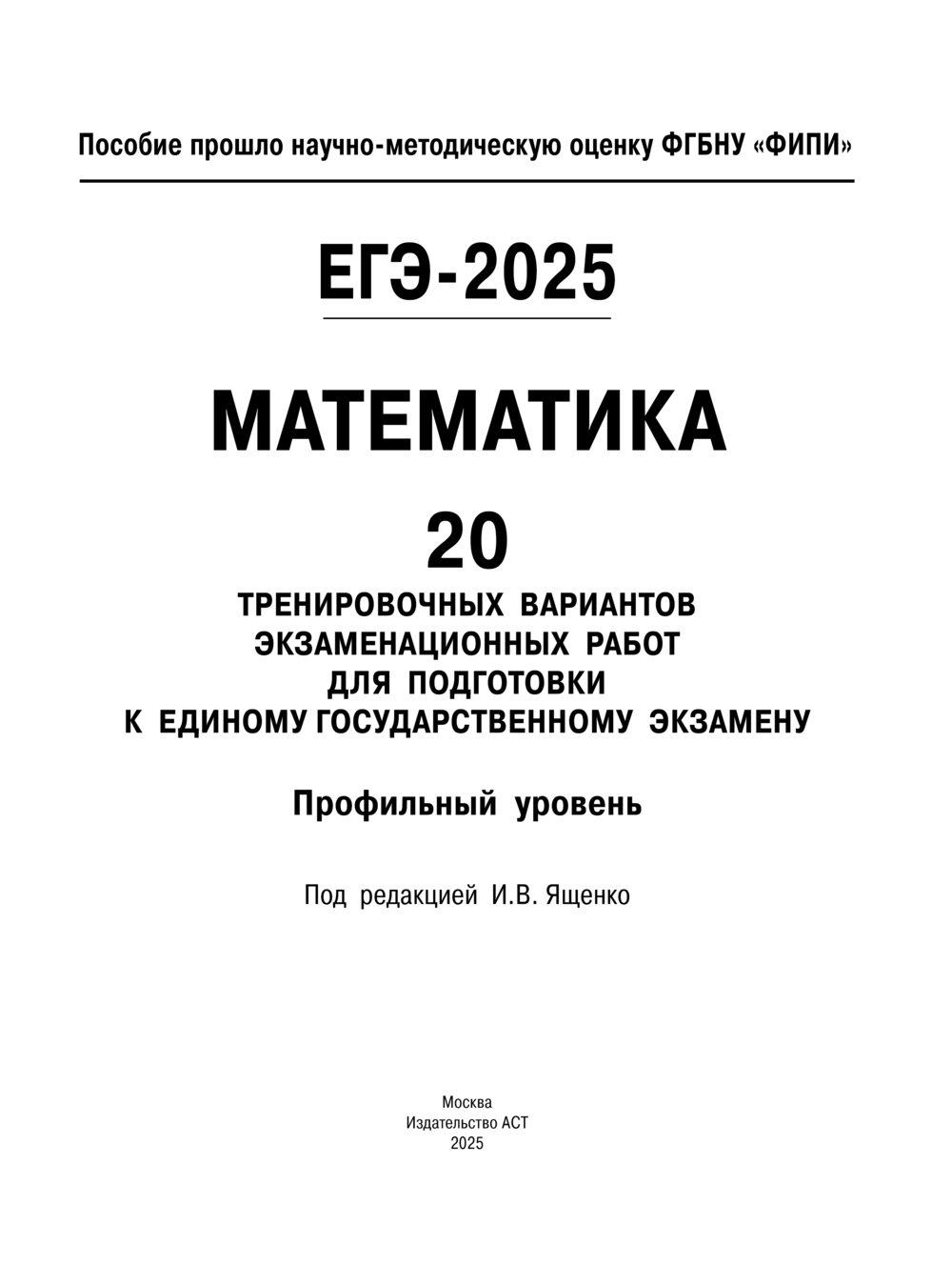 Пособие содержит 20 тренировочных вариантов экзаменационных работ, составленных в соответствии с демонстрационным вариантом и спецификацией 2025 года, и включает задания разных типов и уровней сложности. Для вашего удобства после каждого варианта дан образец экзаменационного бланка для записи ответов.