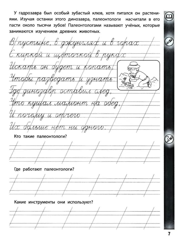 Наполнение тренажёра разнообразное: короткие рассказы, загадки, пословицы, рисунки для раскрашивания. Тренажёр даёт ребёнку возможность поработать самостоятельно и проявить творческие способности. Отвечая на вопросы, составляя тексты, ученик развивает тем самым мыслительные и логические навыки.