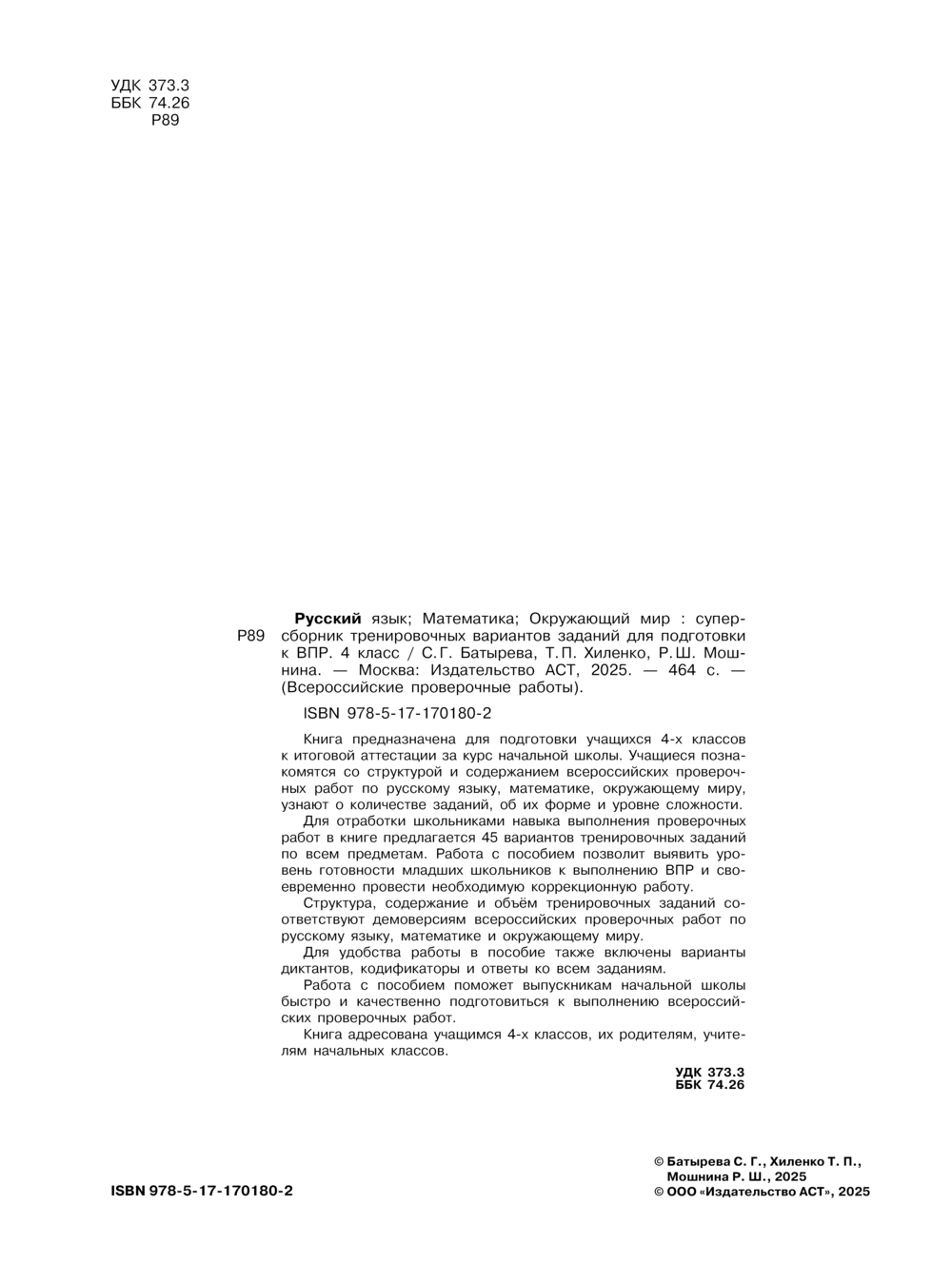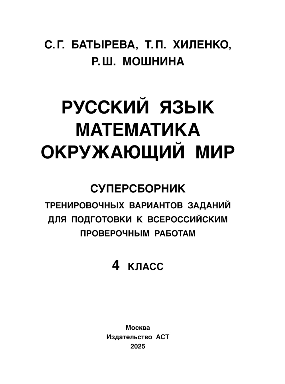 Для отработки школьниками навыка выполнения проверочных работ в книге предлагается 45 вариантов тренировочных заданий по всем предметам. Работа с пособием позволит выявить уровень готовности младших школьников к выполнению ВПР и своевременно провести необходимую коррекционную работу.