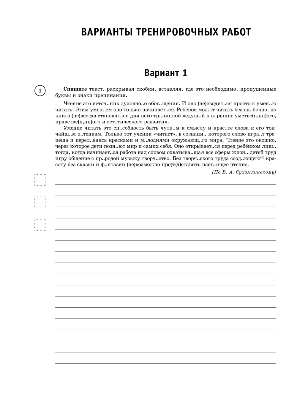 Каждый вариант содержит задания на проверку орфографической, орфоэпической, пунктуационной и языковой грамотности, умения работать с текстом. В конце книги даны ответы на все задания.