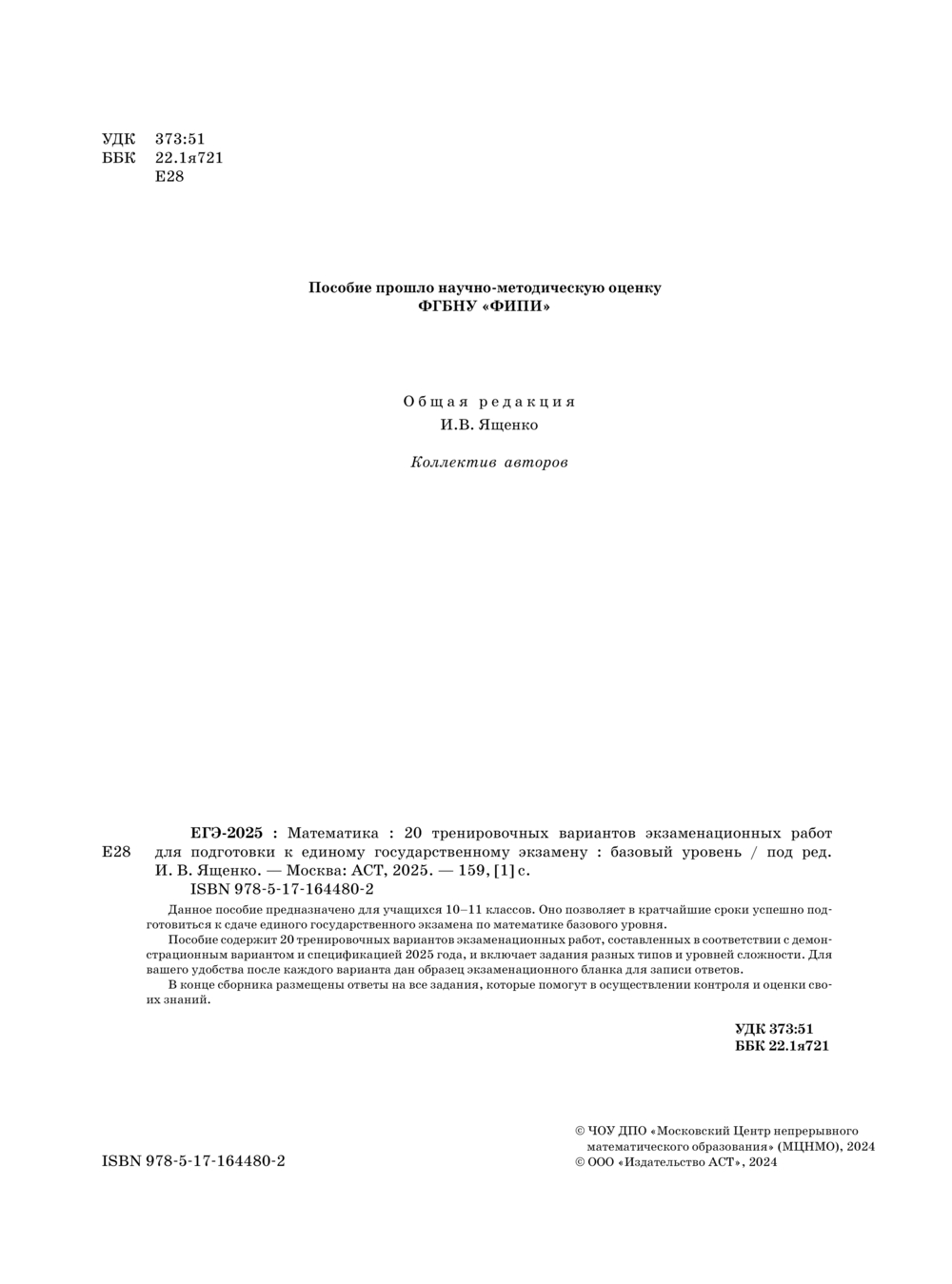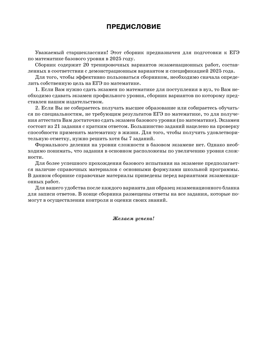 Пособие содержит 20 тренировочных вариантов экзаменационных работ, составленных в соответствии с демонстрационным вариантом и спецификацией 2025 года, и включает задания разных типов и уровней сложности. Для вашего удобства после каждого варианта дан образец экзаменационного бланка для записи ответов.