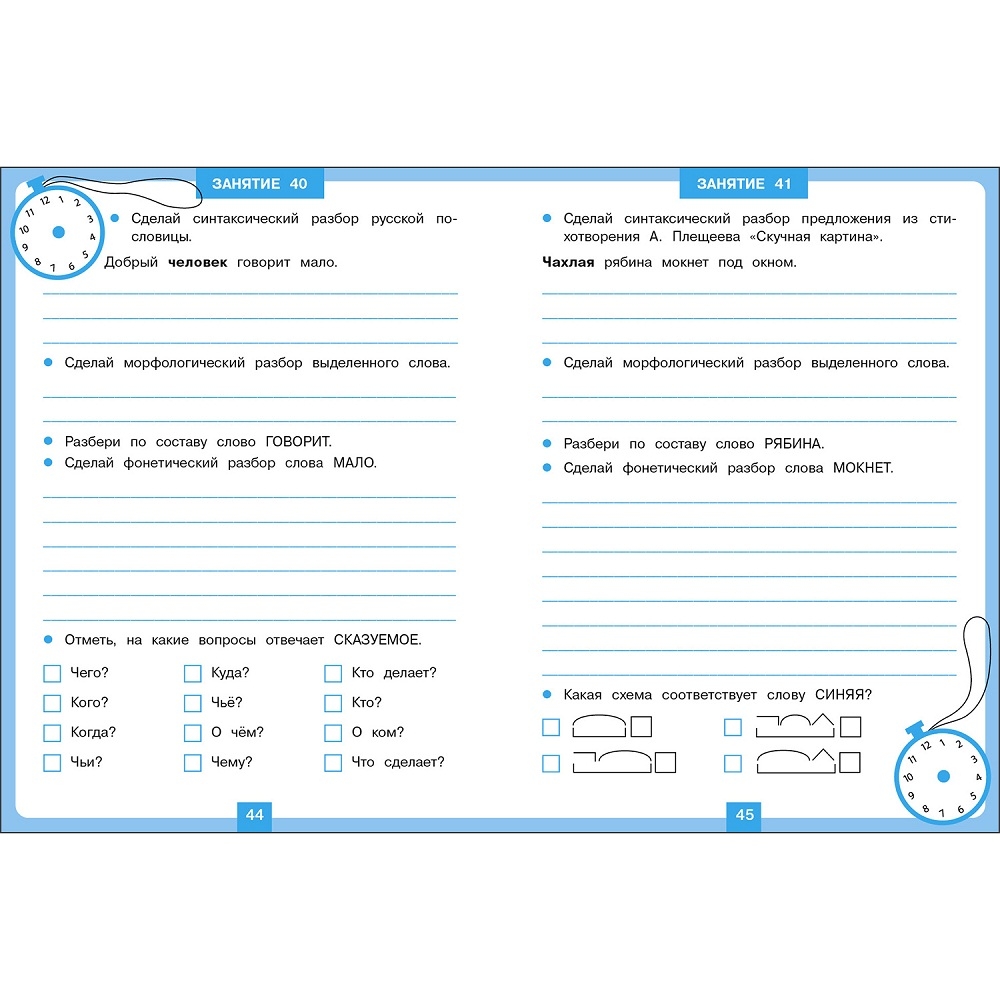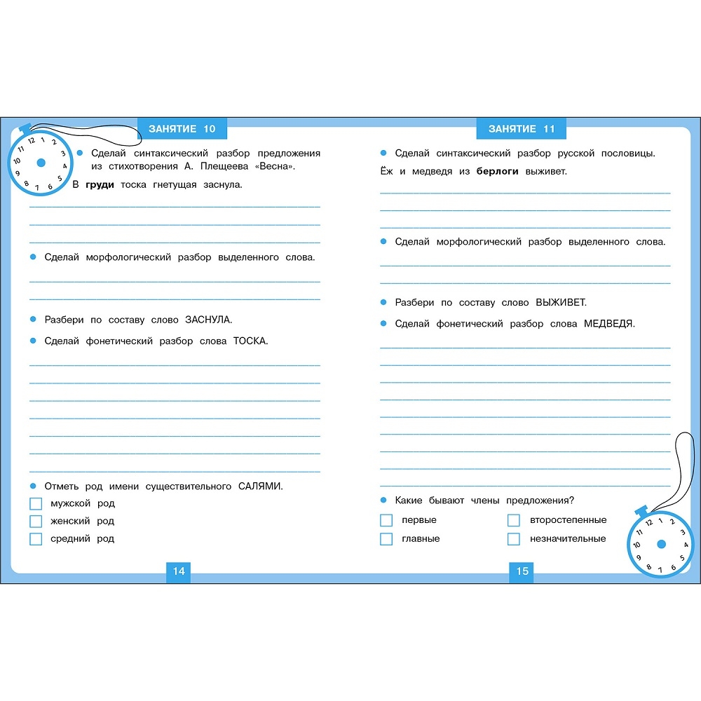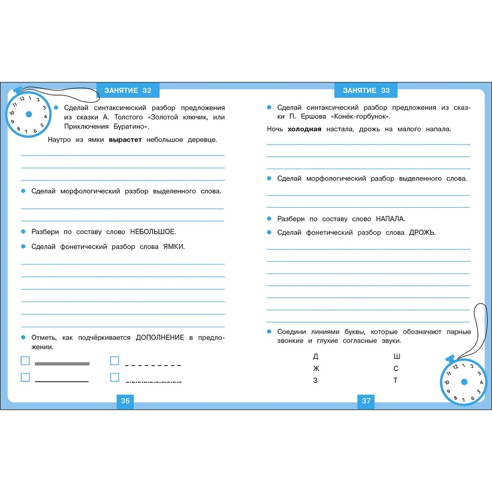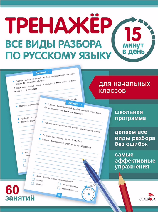 Этот тренажёр предназначен для дополнительных занятий в начальной школе. В нём представлены задания на все виды разборов, изучаемые в 1-4 классах. В пособии даны упражнения разного типа – это поможет поддержать у детей интерес к занятиям. На нарисованных часах можно отмечать время, за которое были сделаны задания. Это даст учащимся дополнительную мотивацию для выполнения упражнений. Занимаясь всего 15 минут в день, дети не будут чувствовать переутомления, и концентрация внимания останется на высоком уровне.