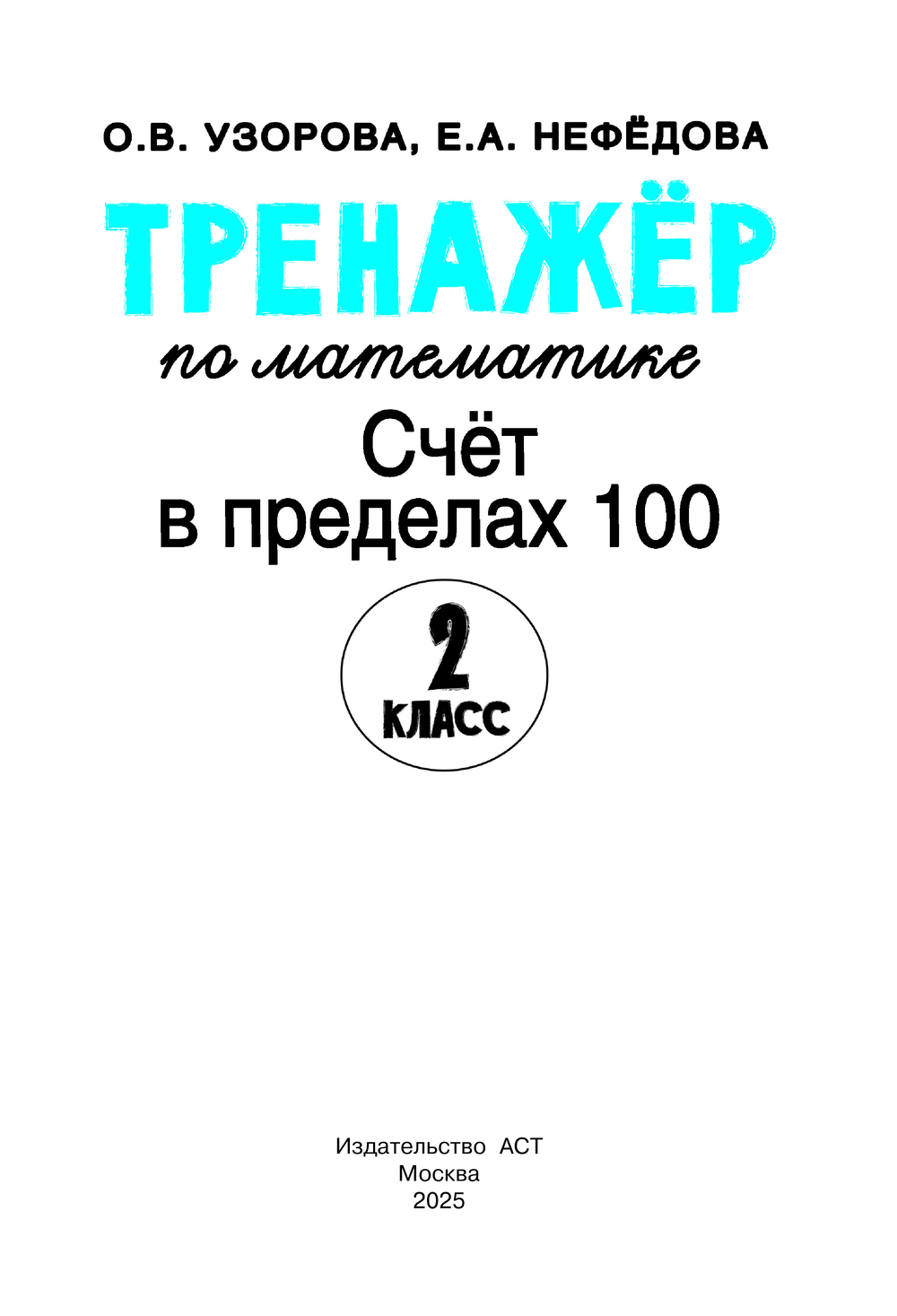 Учебное пособие известного педагога-практика О. В. Узоровой "Счёт в пределах 100. Тренажёр по математике. 2-й класс" познакомит ученика 2-го класса с простыми способами складывать и вычитать числа в пределах 100. Для отработки каждого из этих способов школьнику предлагается за рекомендуемое время выполнить задания с примерами.