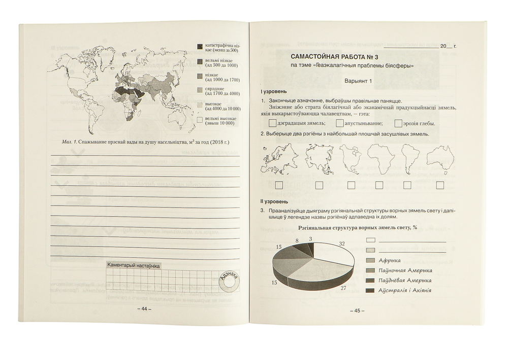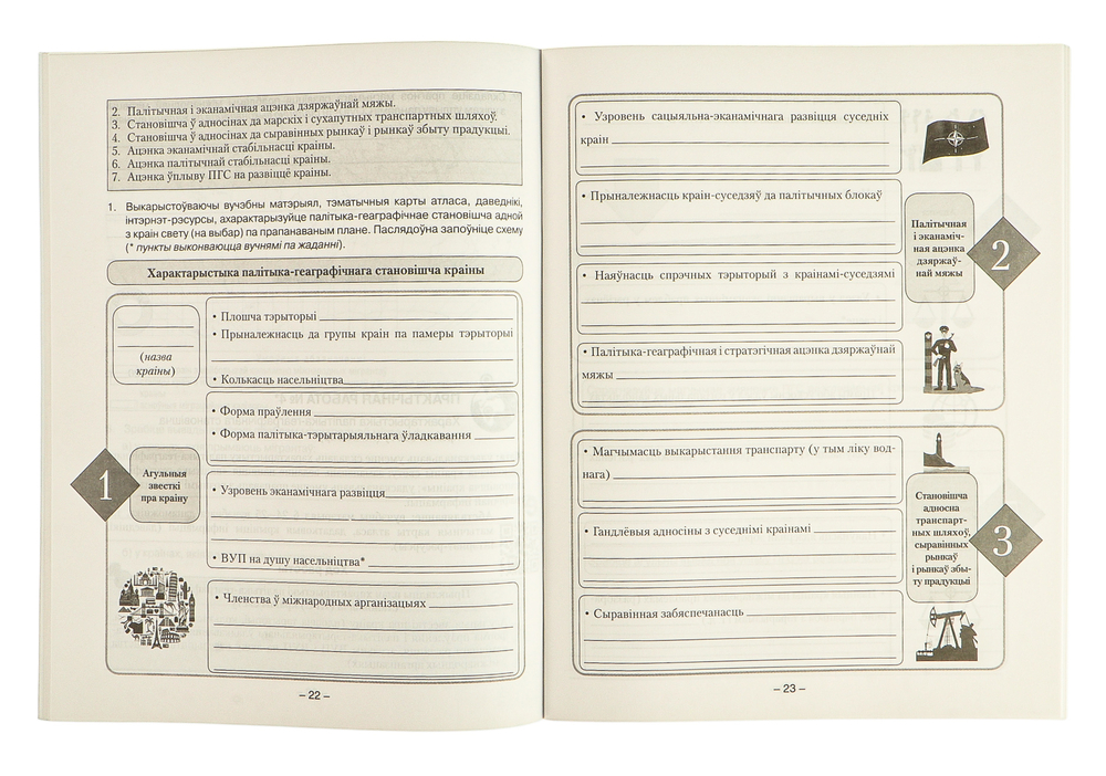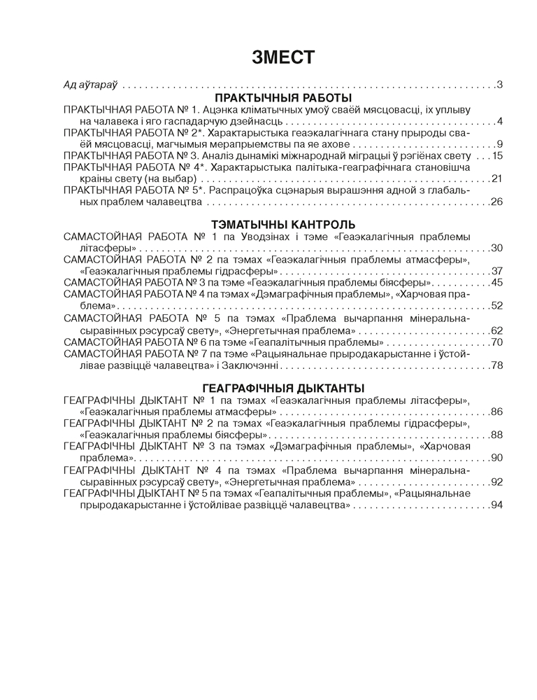 Сшытак складзены ў адпаведнасці з вучэбнай праграмай і вучэбным дапаможнікам для 11 класа. Выданне ўключае практычныя работы, прадугледжаныя вучэбнай праграмай, самастойныя работы, прызначаныя для тэматычнага кантролю, а таксама геаграфічныя дыктанты для самаправеркі. Выкарыстанне сшытка дапаможа лепш засвоіць вучэбны матэрыял, скараціць час на выкананне работ вучнямі і іх праверку настаўнікам.
