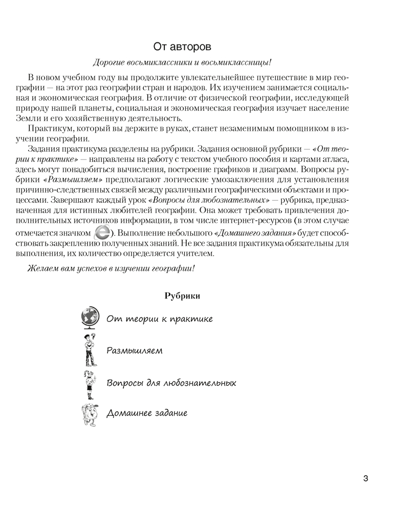 Широкий набор заданий разного уровня сложности направлен на формирование у учащихся ключевых географических компетенций. Представленные в практикуме алгоритмы выполнения заданий и примеры их оформления способствуют развитию у учащихся навыков самостоятельной работы.