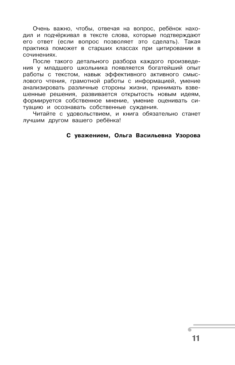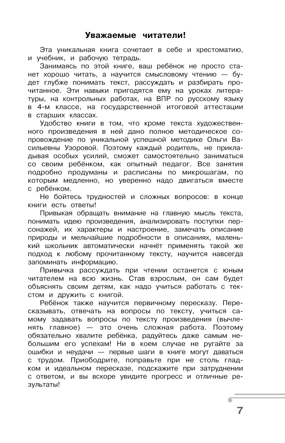Книга сочетает в себе хрестоматию и практикум. Кроме текста художественных произведений в книге дано полное методическое сопровождение, где детально объясняется, как ребёнок должен работать с текстом. В конце книги размещены ответы на вопросы, которые могут вызвать затруднения.