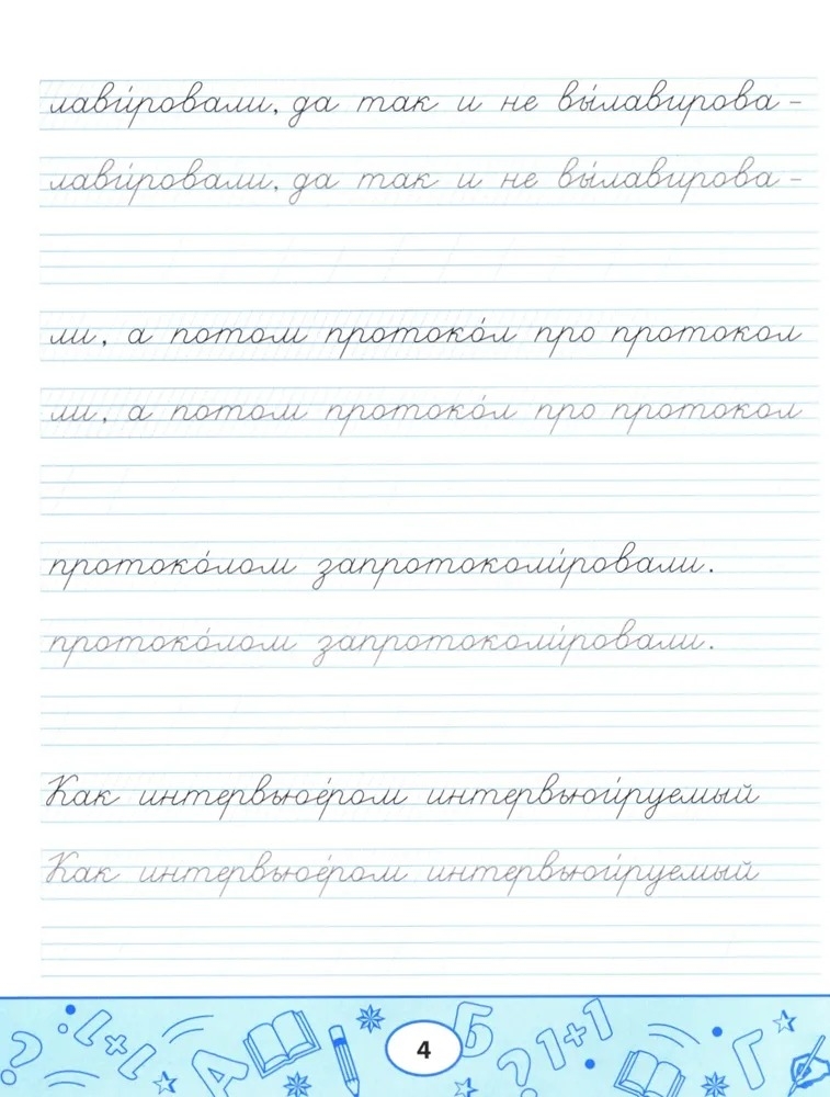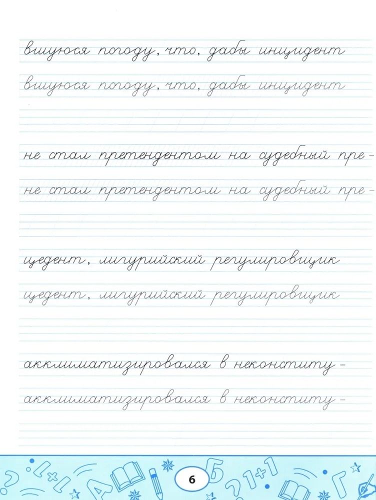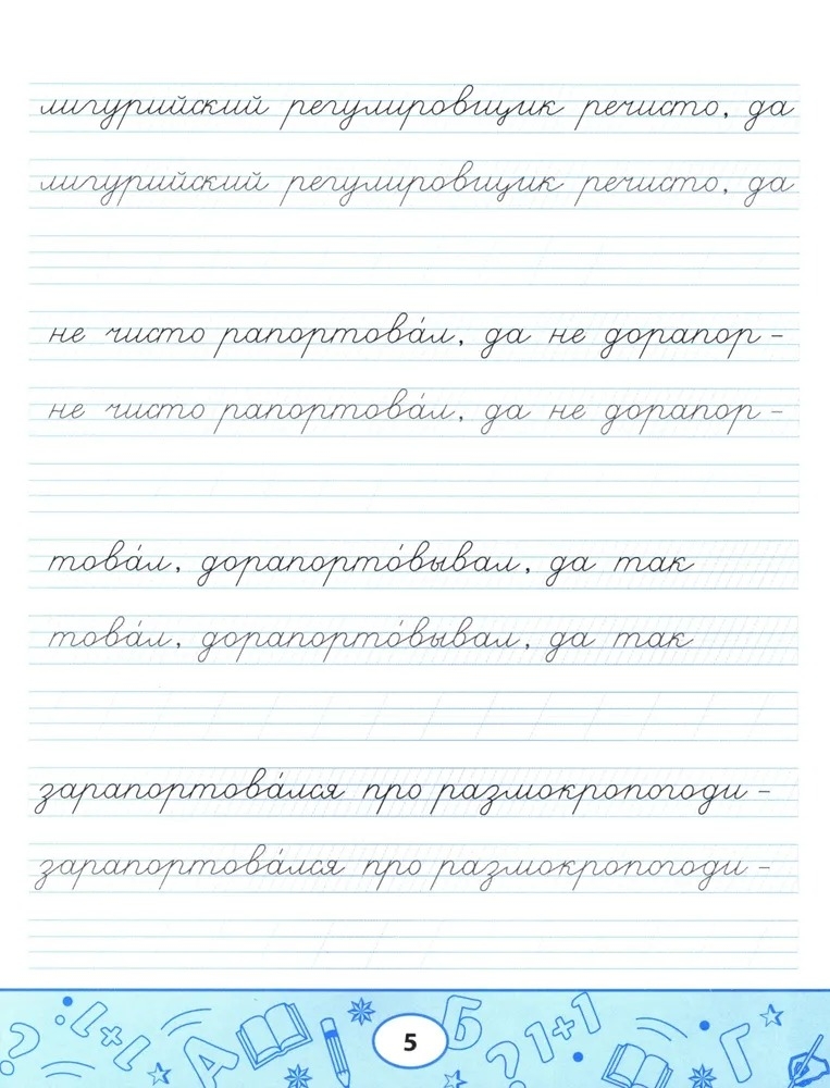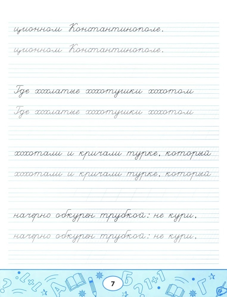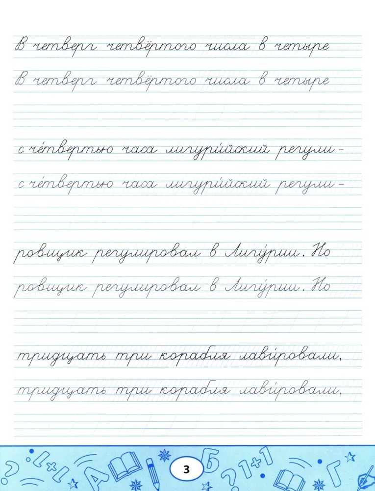 Пропись-скороговорка – комплексный тренажёр, направленный не только на формирование устойчивого почерка, но и на отработку чёткости дикции, развитие памяти, орфографической зоркости и навыков грамотного письма. Пишите аккуратно, проговаривайте вслух скороговорку, рассказывайте её наизусть с выражением: так вы будете не только вырабатывать каллиграфический почерк, но и совершенствовать произношение и активизировать память.