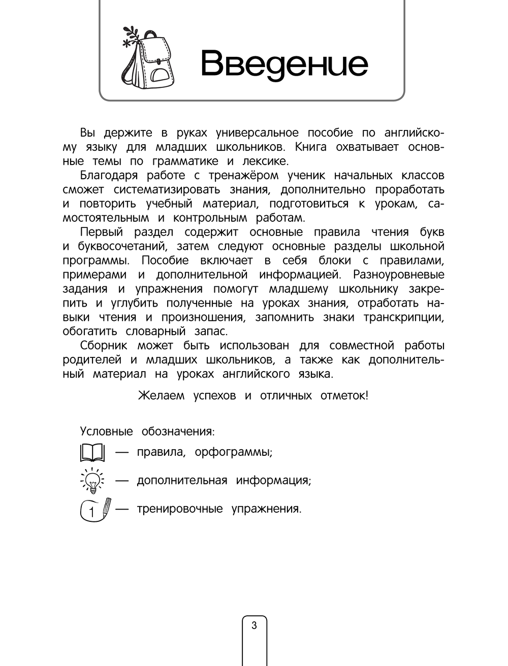 Тематический тренажёр по английскому языку предназначен для систематизации знаний учащихся, дополнительной проработки сложных тем, подготовки к самостоятельным и контрольным работам, а также к итоговому тестированию за курс начальной школы. Благодаря работе с этим пособием ученики повторят и закрепят в памяти учебный материал. Это особенно актуально для школьников, испытывающих трудности в освоении и запоминании больших объёмов материала. Тетрадь-тренажёр включает в себя основные разделы школьной программы по английскому языку, блоки с правилами, примерами и дополнительной полезной информацией. Тетрадь-тренажёр можно использовать для совместной работы младших школьников с родителями, а также как дополнительный материал на уроках английского языка.