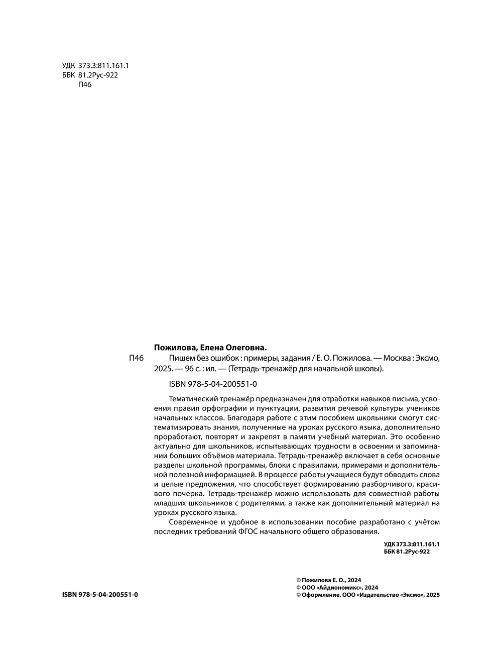 Тематический тренажёр предназначен для отработки навыков письма, усвоения правил орфографии и пунктуации, развития речевой культуры учеников начальных классов. Благодаря работе с этим пособием школьники смогут систематизировать знания, полученные на уроках русского языка, дополнительно проработают, повторят и закрепят в памяти учебный материал. Это особенно актуально для школьников, испытывающих трудности в освоении и запоминании больших объёмов материала. Тетрадь-тренажёр включает в себя основные разделы школьной программы, блоки с правилами, примерами и дополнительной полезной информацией. В процессе работы учащиеся будут обводить слова и целые предложения, что способствует формированию разборчивого, красивого почерка. Тетрадь-тренажёр можно использовать для совместной работы младших школьников с родителями, а также как дополнительный материал на уроках русского языка.