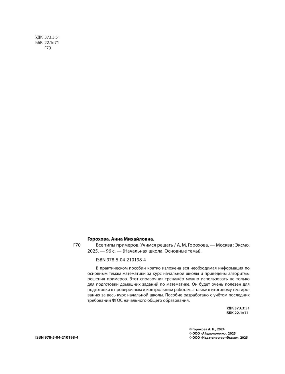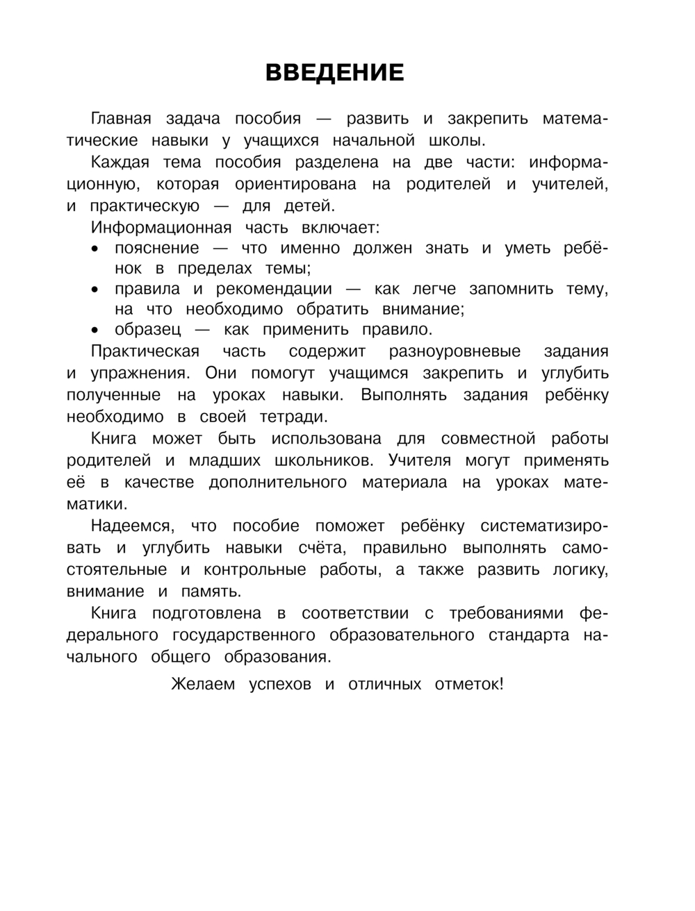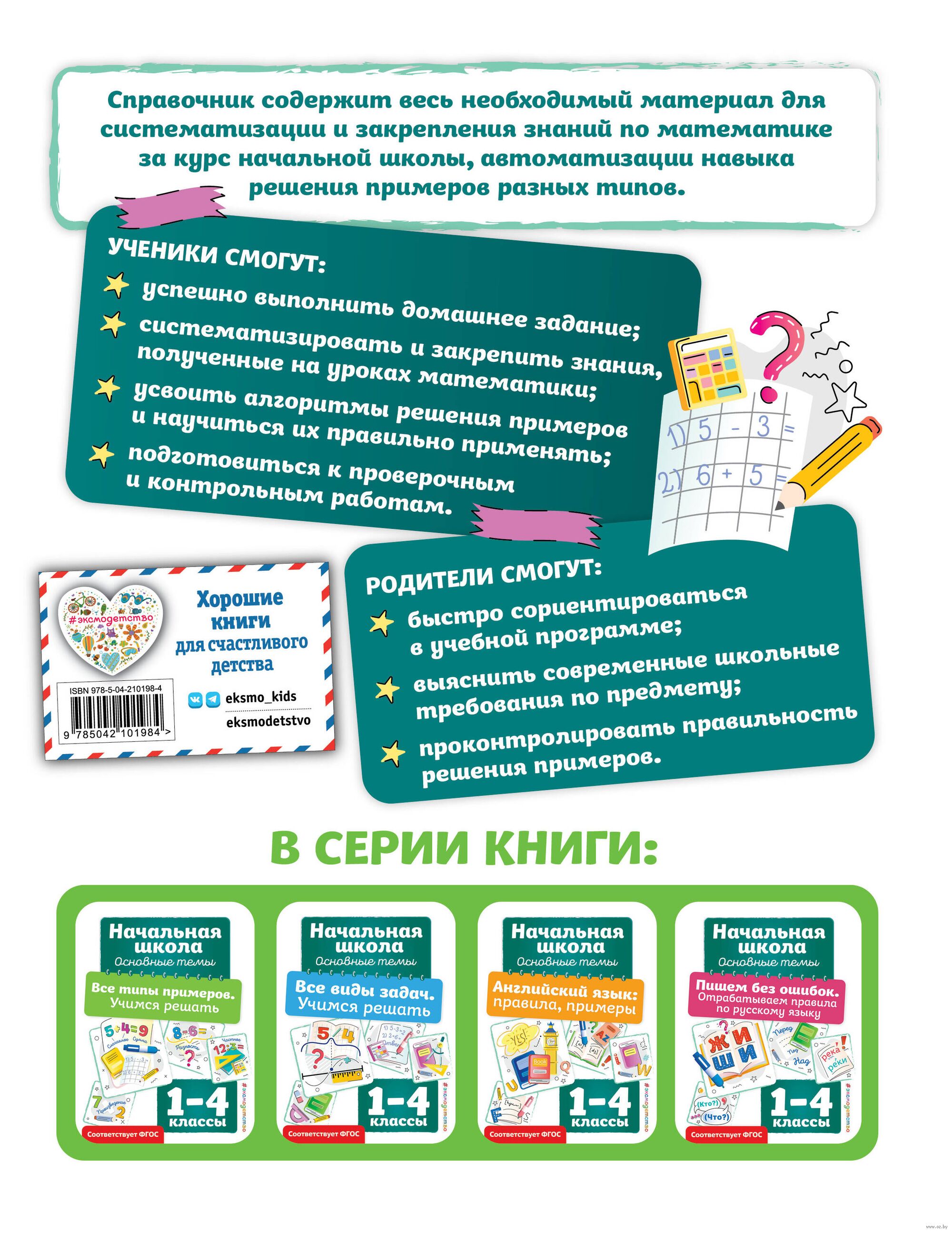 В практическом пособии кратко изложена вся необходимая информация по основным темам математики за курс начальной школы и приведены алгоритмы решения примеров. Этот справочник-тренажёр можно использовать не только для подготовки домашних заданий по математике. Он будет очень полезен для подготовки к проверочным и контрольным работам, а также к итоговому тестированию за весь курс начальной школы. Пособие разработано с учётом последних требований ФГОС начального общего образования.