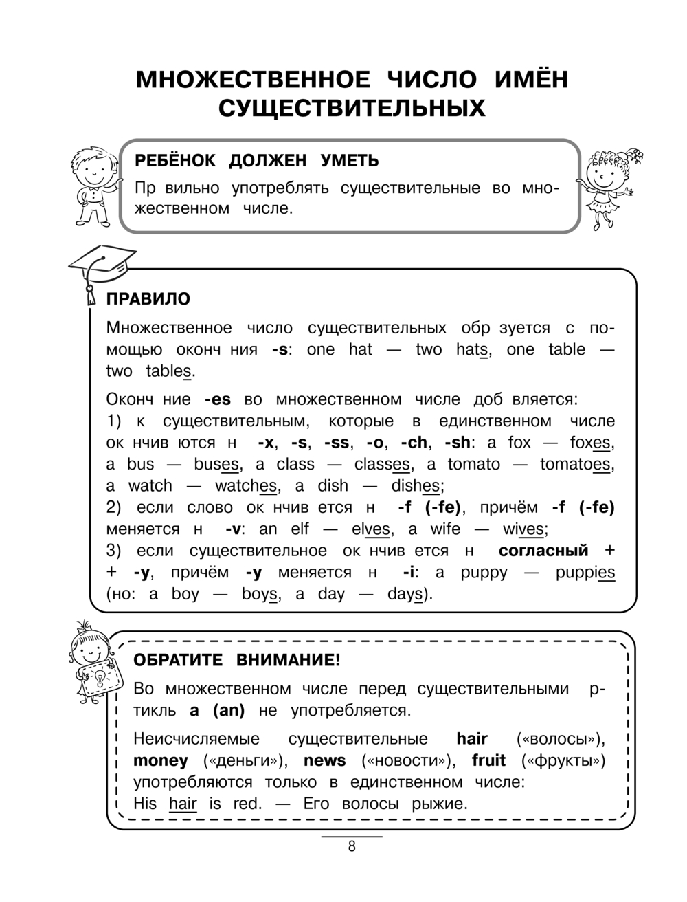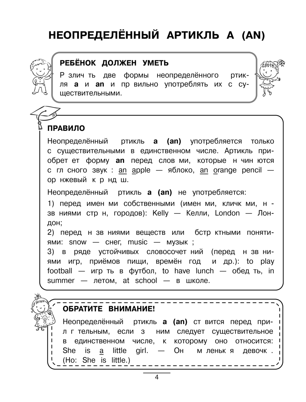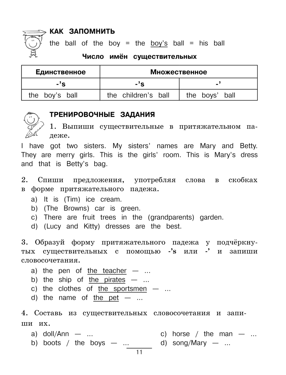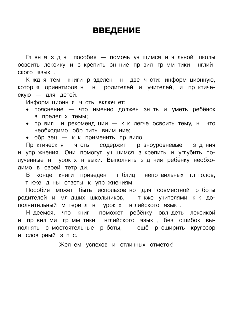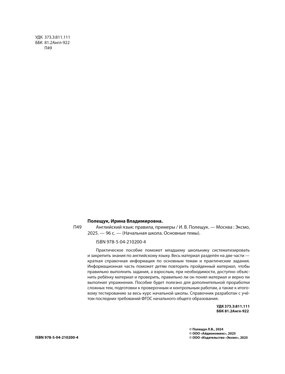 Практическое пособие поможет младшему школьнику систематизировать и закрепить знания по английскому языку. Весь материал разделён на две части – краткая справочная информация по основным темам и практические задания. Информационная часть поможет детям повторить пройденный материал, чтобы правильно выполнить задания, а взрослым, при необходимости, доступно объяснить ребёнку материал и проверить, правильно ли он понял материал и верно ли выполнил упражнения. Пособие будет полезно для дополнительной проработки сложных тем, подготовки к проверочным и контрольным работам, а также к итоговому тестированию за весь курс начальной школы.