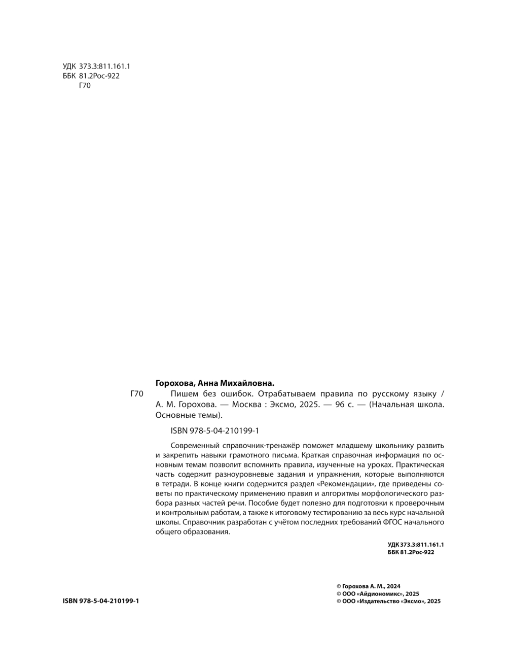 Современный справочник-тренажёр поможет младшему школьнику развить и закрепить навыки грамотного письма. Краткая справочная информация по основным темам позволит вспомнить правила, изученные на уроках. Практическая часть содержит разноуровневые задания и упражнения, которые выполняются в тетради. В конце книги содержится раздел "Рекомендации", где приведены советы по практическому применению правил и алгоритмы морфологического разбора разных частей речи. Пособие будет полезно для подготовки к проверочным и контрольным работам, а также к итоговому тестированию за весь курс начальной школы.