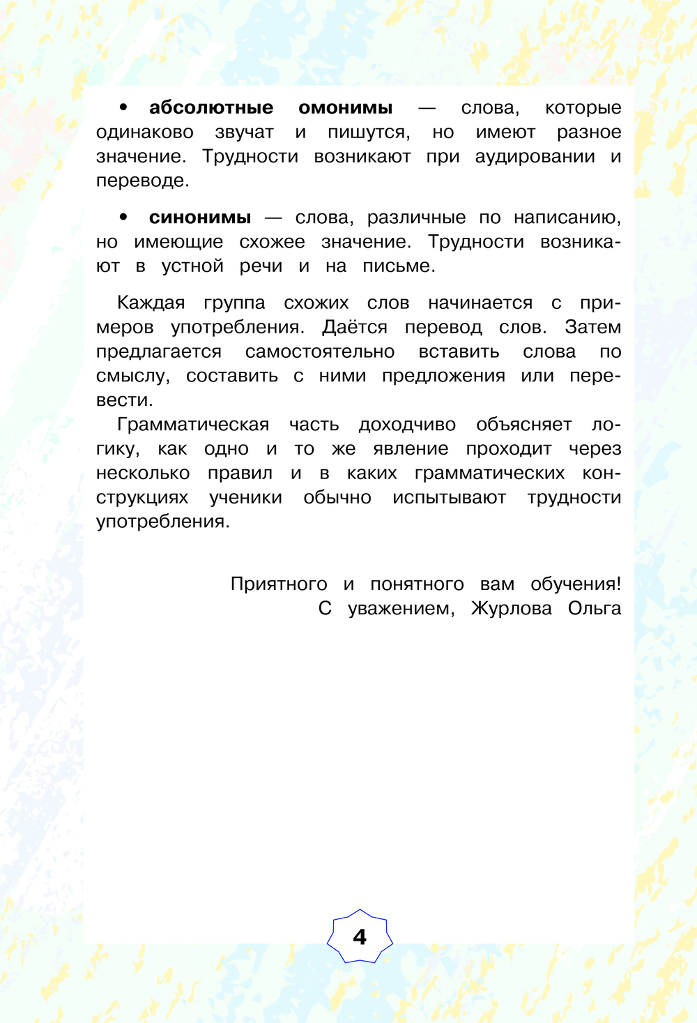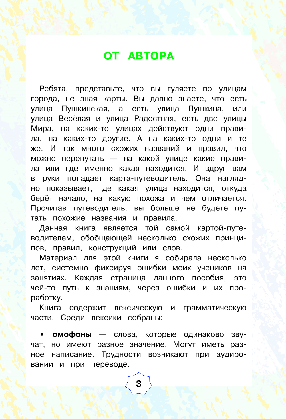 Автор предлагает уникальное пособие, в котором собраны вся лексика и грамматика английского языка, вызывающие у учащихся путаницу на начальном этапе изучения. В лексической части вы найдёте абсолютные омонимы, омофоны и синонимы. Грамматическая часть доходчиво объясняет логику, как одно и то же явление проходит через несколько правил, и в каких грамматических конструкциях ученики обычно испытывают трудности.
