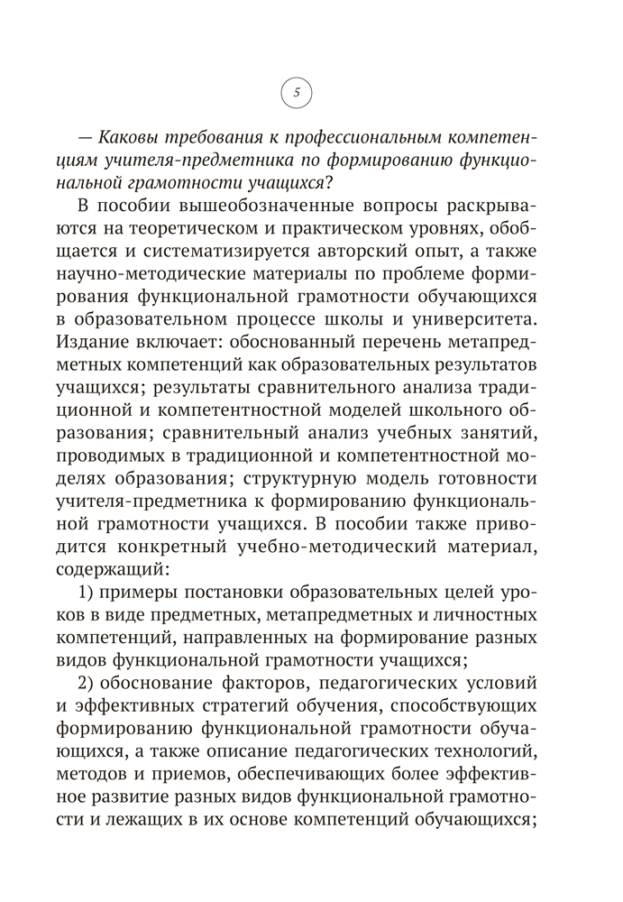В пособии рассматривается функциональная грамотность как важнейший образовательный результат. В книге определяются отличительные особенности функциональной грамотности в сравнении с другими результатами образования; раскрываются педагогические условия, эффективные стратегии, технологии, методы и средства ее формирования и оценки; дается разнообразный практический материал.