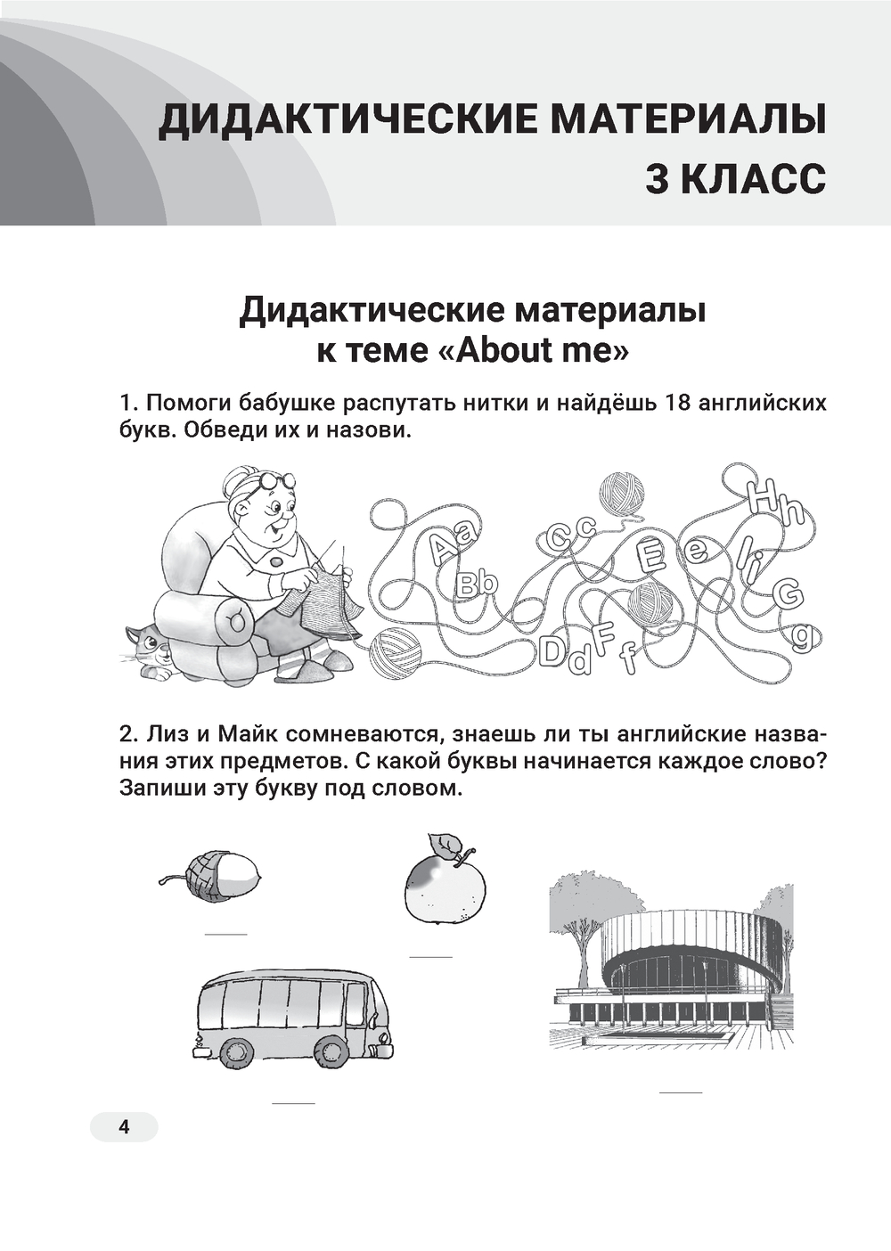 Дидактические материалы содержат материалы для овладения навыками и умениями речевой деятельности на английском языке; диагностические материалы – коммуникативные задания для их контроля.