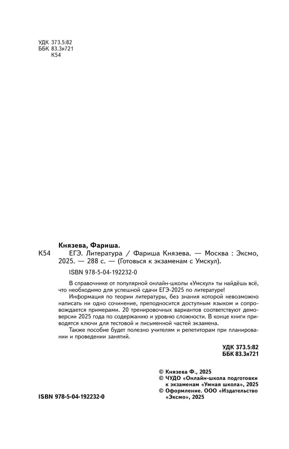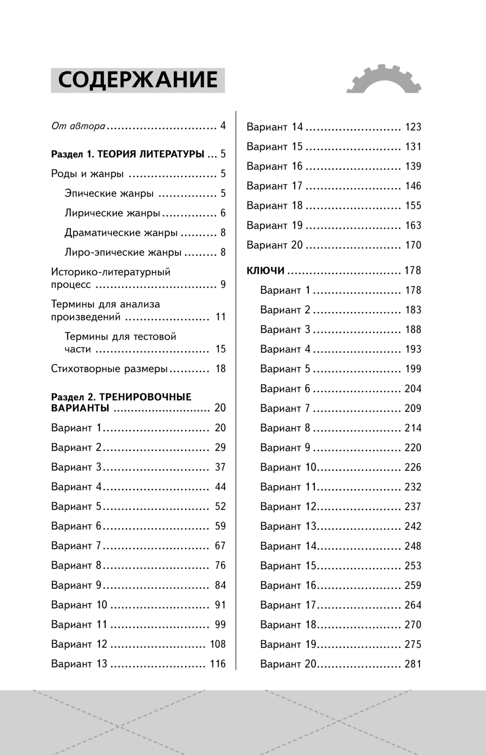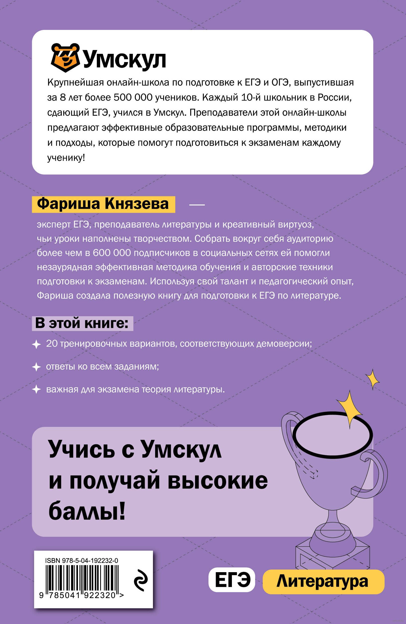 Информация по теории литературы, без знания которой невозможно написать ни одно сочинение, преподносится доступным языком и сопровождается актуальными примерами. 20 тренировочных вариантов соответствуют демоверсии 2025 года по содержанию и уровню сложности. В конце книги приводятся ключи для тестовой и письменной частей экзамена.