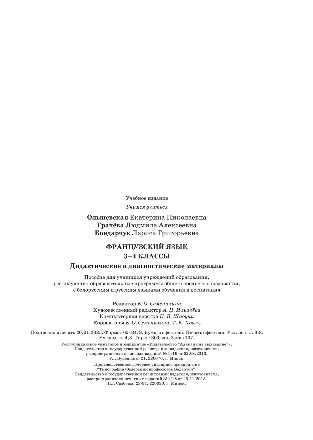 Дидактические материалы содержат материалы для овладения навыками и умениями речевой деятельности на французском языке; диагностические материалы – коммуникативные задания для их контроля. В издании представлено большинство тем, изучаемых в 3–4-х классах.