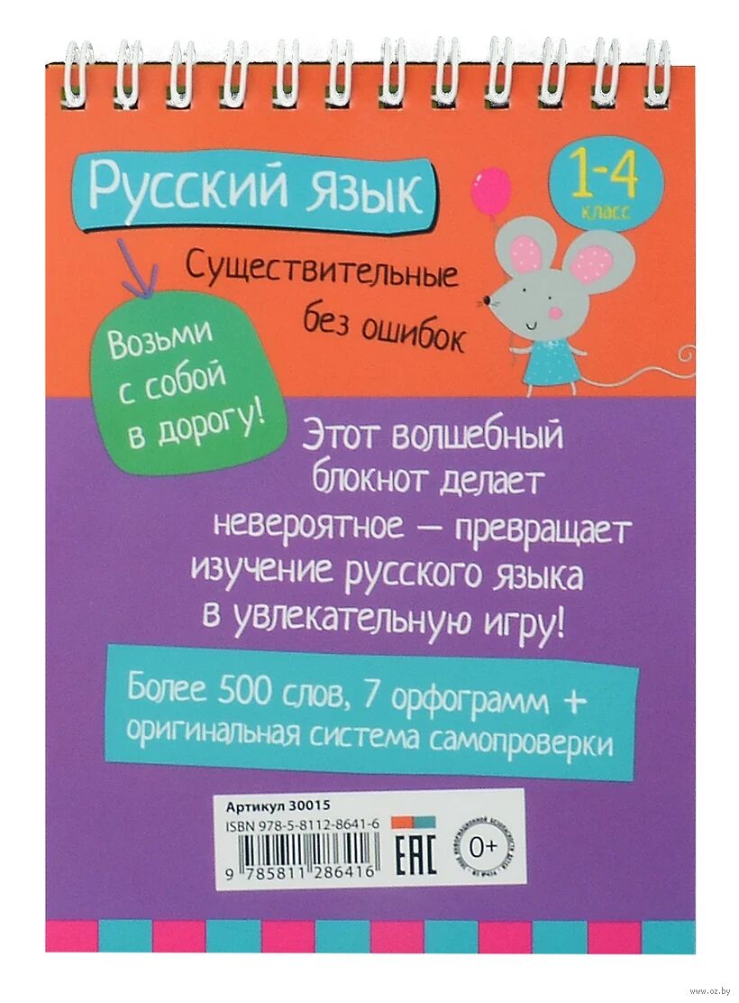 Блокнот содержит увлекательные игры по теме русского языка "Имя существительное". Кроссворды, лабиринты и другие задания помогут ребёнку узнать всё о существительном, "пробежаться" по наиболее трудным вопросам, изучаемым в начальной школе, освоить и закрепить необходимые навыки правописания орфограмм на примере более чем 500 слов. Наглядно представленные правила позволят легко запомнить их и научиться грамотно писать в существительных мягкий знак после шипящих, безударные падежные окончания, а также безошибочно определять род, число и склонение существительных. В блокноте заложена оригинальная система самопроверки и отработки правописания слов. Простота и лёгкость использования блокнота позволяют выполнять задания не только в школе и дома, но и в транспорте и на природе, что делает обучение непринуждённым и в то же время эффективным. Издание для досуга ориентировано на учащихся начальной школы.