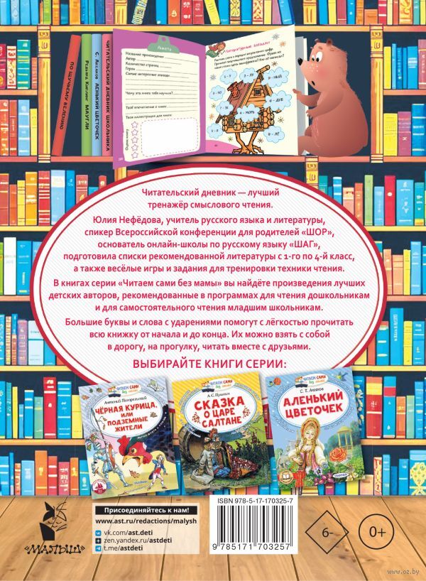 "Читательский дневник школьника" станет незаменимым помощником для будущего отличника. Красочные анкеты, увлекательные игры и головоломки, трекер на месяц помогут сформировать у ребёнка мотивацию и привычку читать. Рекомендации Юлии Нефёдовой, учителя русского языка и литературы, основателя онлайн-школы по русскому языку "ШАГ", научат юных читателей общению с книгой. Регулярная работа с читательским дневником развивает речь и логическое мышление, формирует навык смыслового чтения и написания сочинений. Бонус: список книг для чтения в 1–4 классах и словарик литературных терминов.