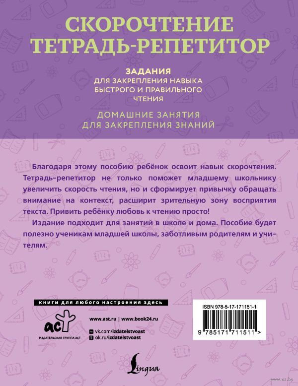 Благодаря этому пособию ребёнок освоит навык скорочтения. Задания в книге помогут привить интерес к чтению, а также поспособствуют расширению зрительной зоны восприятия текста. Пособие не только поможет увеличить скорость чтения, но и сформирует привычку обращать внимание на контекст.