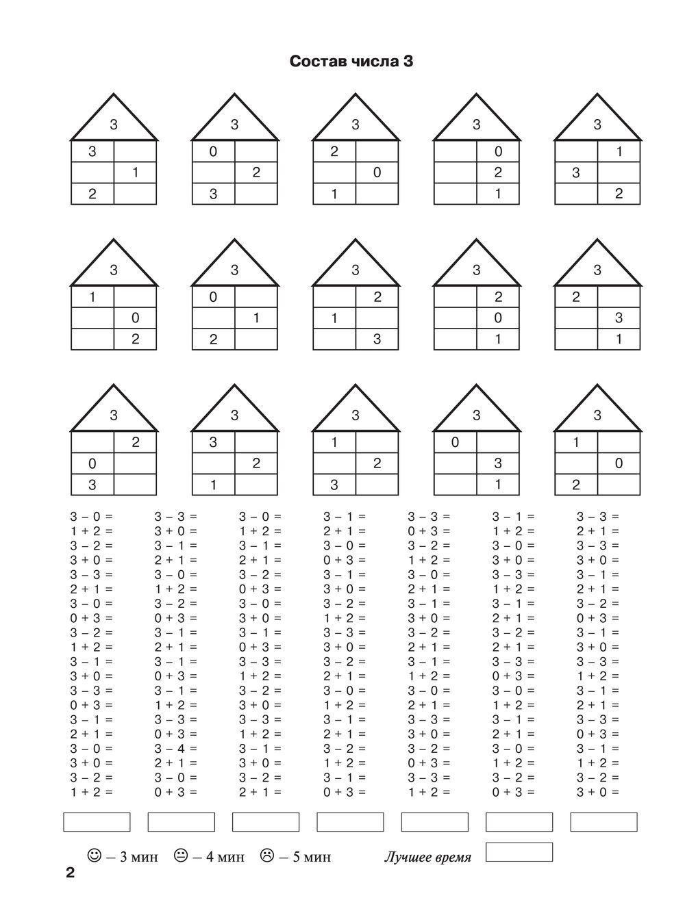 На каждой странице приведены 7 столбиков по 27 примеров каждый. Как показывает практика, ученик полностью освоил тему, если решает пример и записывает ответ в течение 4-7 секунд. В этом случае можно говорить, что навык счёта доведён до автоматизма.